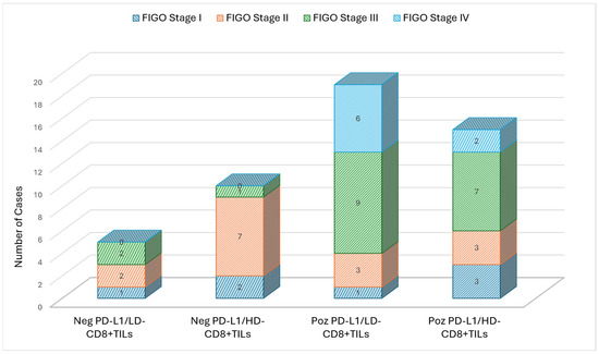 Case distribution according to clinical FIGO stage and expression of PD-L1 and CD8+ TILs.