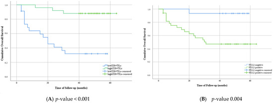 Several studies observed a close connection between PD-L1 expression and levels of CD8+ TILs. The study by Ishikawa M. et al. (2020) and Chen J et al. (2020) proved that PD-L1 expression is negatively correlated with the levels of CD8+ TILS [36,37]. Our research recorded similar results and is in agreement with this observation regarding prognosis: patients with a PD-L1-positive expression and low levels of CD8+ TILs have worse overall survival compared to cases in which PD-L1 is negative but higher levels of CD8+ TILs are present [16,37].