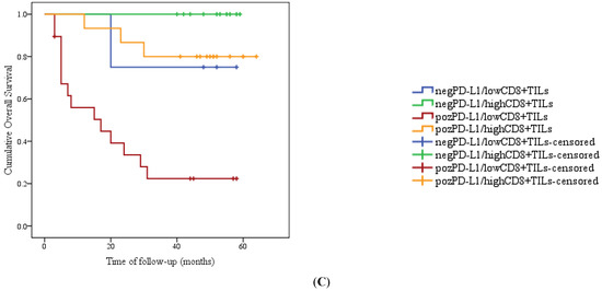 Kaplan–Meier plot of overall survival in categories with low or high levels of CD8+ TILs (A); negative expression versus positive expression of PD-L1 (B), and different groups based on the immunostaining evaluation of PD-L1 and CD8+ TILs (C).