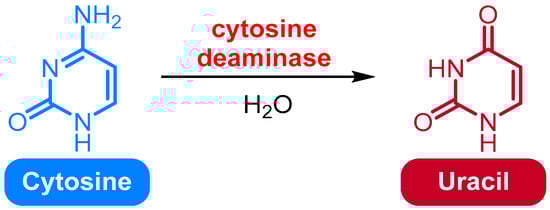 Cytosine deamination is a chemical reaction in which the cytosine base in DNA is converted to uracil (Figure 3). This reaction is catalyzed by deaminases, enzymes that remove an amino group from the cytosine base. The reaction is irreversible, and the uracil is not replaced by cytosine. This reaction can lead to mutations in the DNA sequence, and thus is not incorporated into the newly synthesized DNA strand [].