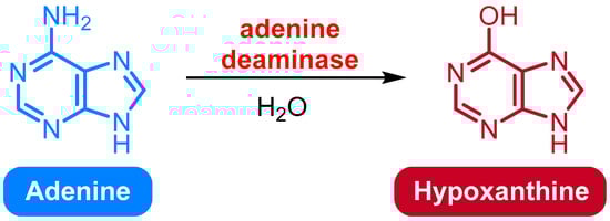 Adenine can be deaminated to hypoxanthine through the action of the enzyme adenine deaminase (ADA) (Figure 4). ADA is an enzyme that catalyzes the conversion of adenine to hypoxanthine. The reaction is an important part of purine metabolism and is essential for the maintenance of the cellular adenine nucleotide pool [].