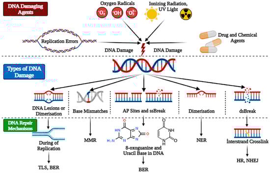 DNA repair mechanisms are processes by which cells detect and correct damage to the DNA molecules that encode their genomes. In human cells, both normal metabolic activities and environmental factors such as blue light and radiation can cause DNA damage, resulting in as many as one million individual molecular lesions per cell per day []. These lesions can include base modifications, sugar damage, and single- or double-strand breaks. DNA repair mechanisms are essential for the maintenance of genomic integrity, and their failure can lead to mutations, cell death, and cancer. There are several types of DNA repair mechanisms, including base excision repair (BER) nucleotide excision repair (NER), mismatch repair (MMR), homologous recombination (HR), and non-homologous end joining (NHEJ) (Figure 5). Each of these mechanisms has a specific role in repairing different types of DNA damage [,].