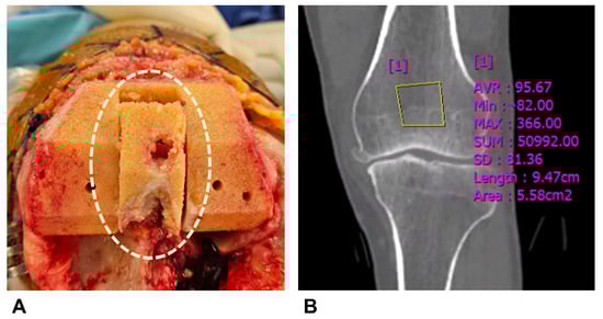 Preoperative CT imaging was obtained one week before TKA on a CT scanner (SOMATOM Force; Siemens Healthineers, Erlangen, Germany). Images were obtained in supine position with craniocaudal direction with 1 mm slice thickness. HU measurements were performed on a single coronal slice at the level of the box region, using one rectangular region of interest (ROI) per site. The HU value obtained from this slice was used for each patient (Figure 1). Measurements were performed preoperatively by the assisting surgeon and exclusively conducted within cancellous bone regions of the box area, excluding cortical bone to minimize measurement error.