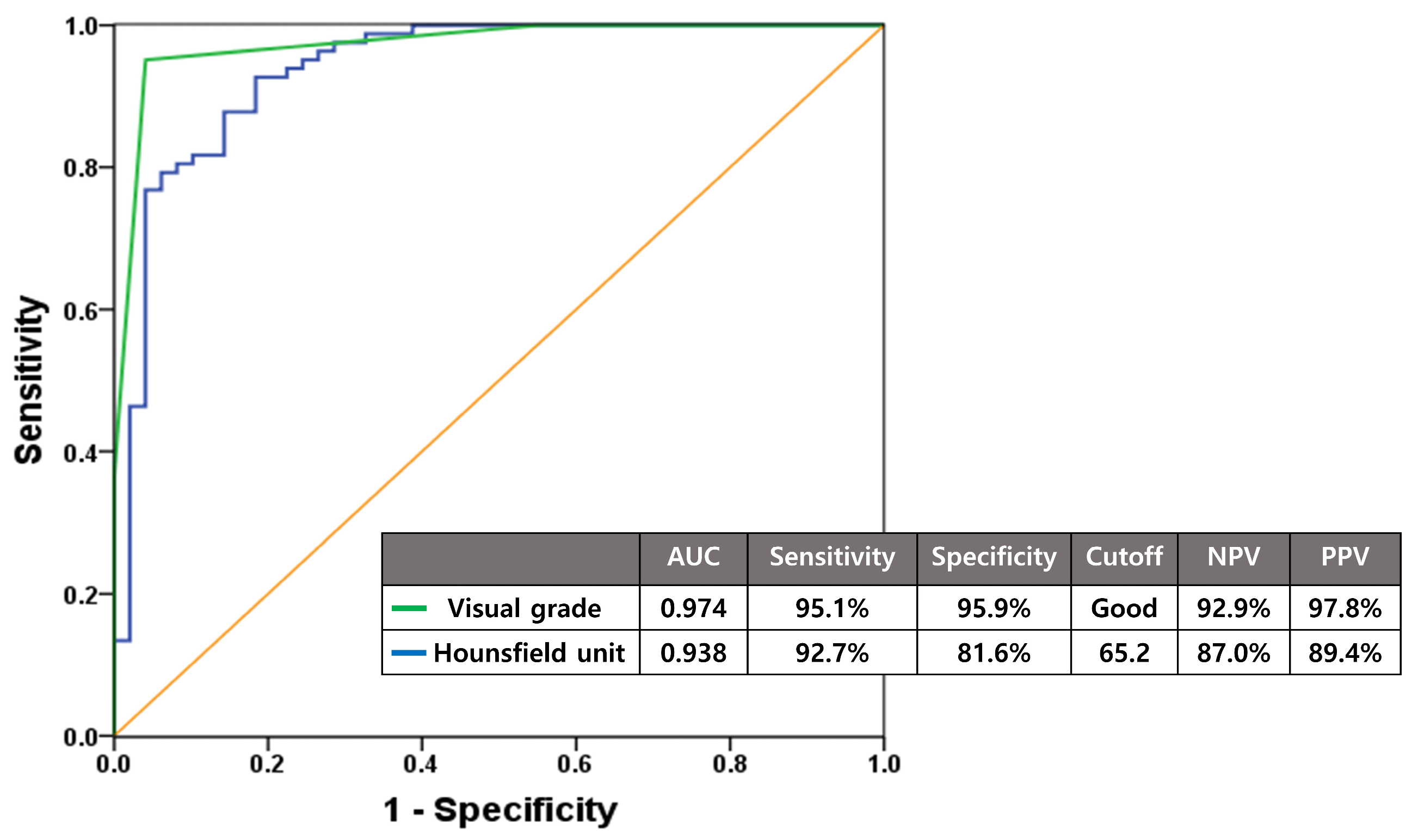 3.2. Diagnostic Performance of Visual Grade and Hounsfield Units for Cementless TKA Suitability