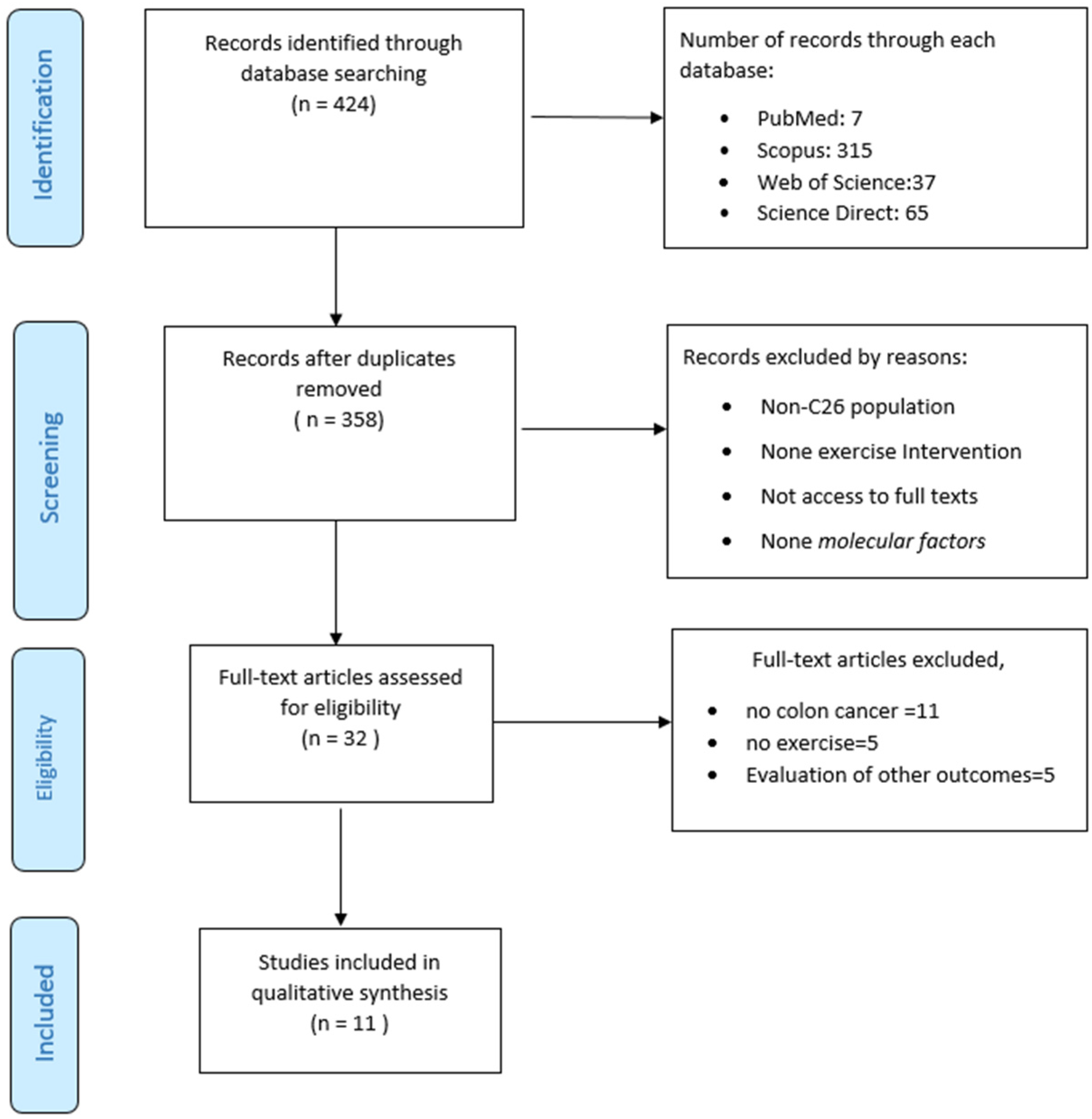 The systematic search initially identified 424 records (PubMed = 7, Scopus = 315, Web of Science = 37 and Science Direct = 65). After removal of duplicates, 358 studies remained for screening. Following title and abstract screening, 32 articles were assessed for full-text eligibility. Of these, 21 articles were excluded (11 did not involve colon cancer models, 5 lacked exercise interventions, and 5 evaluated outcomes unrelated to molecular factors). Finally, 11 studies met the inclusion criteria and were included in the qualitative synthesis (Figure 1).