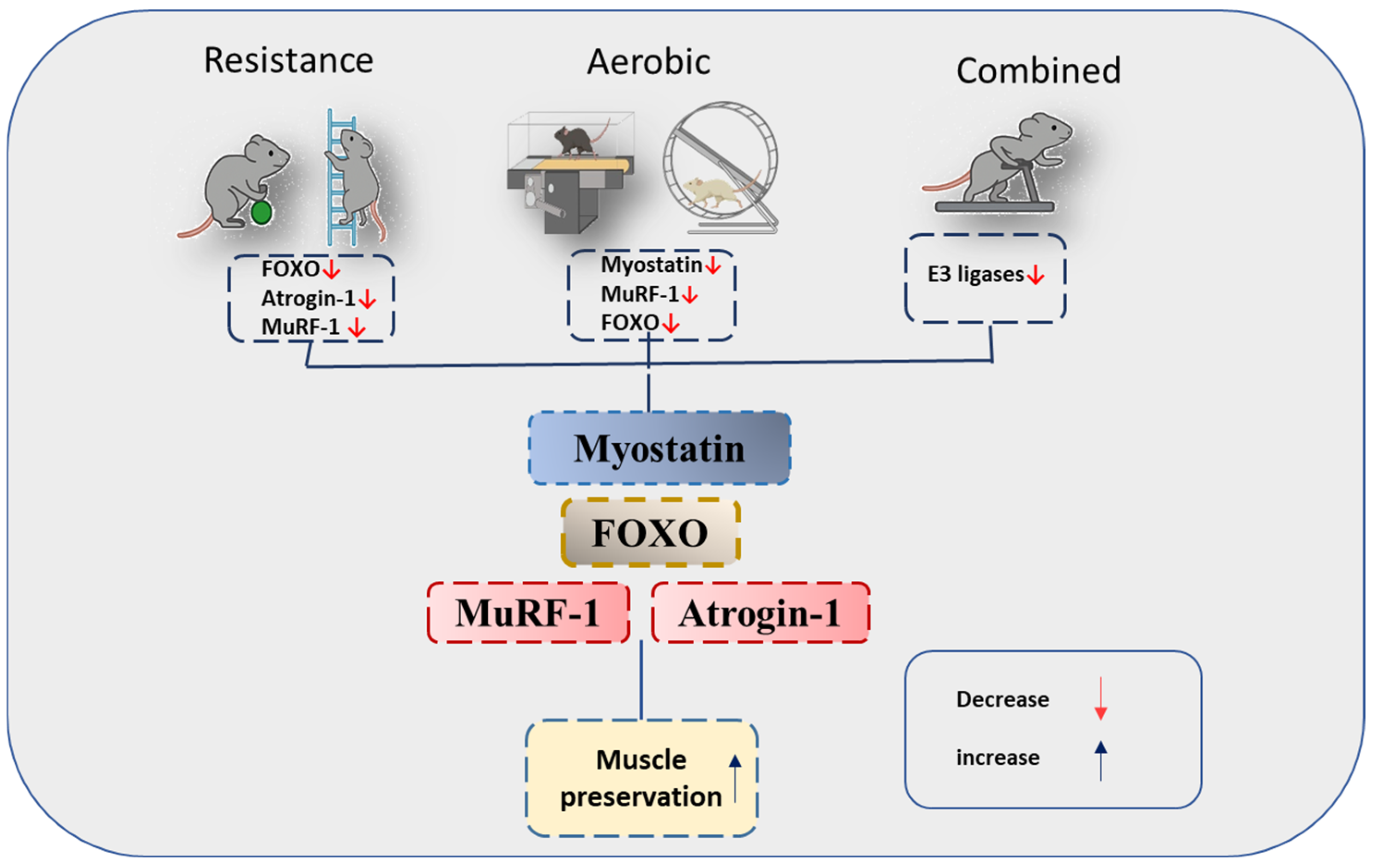 Emerging evidence suggests exercise training may mitigate this catabolic pathway, offering a non-invasive strategy to preserve muscle mass [15]. Translational studies show that exercise, particularly resistance training, downregulates myostatin and FOXO activity, reducing MuRF-1 and Atrogin-1 expression, attenuating muscle catabolism, and preserving muscle mass [15,16]. Concurrently, exercise enhances anabolic signaling (e.g., mTORC1), promoting protein synthesis and metabolic homeostasis [17].