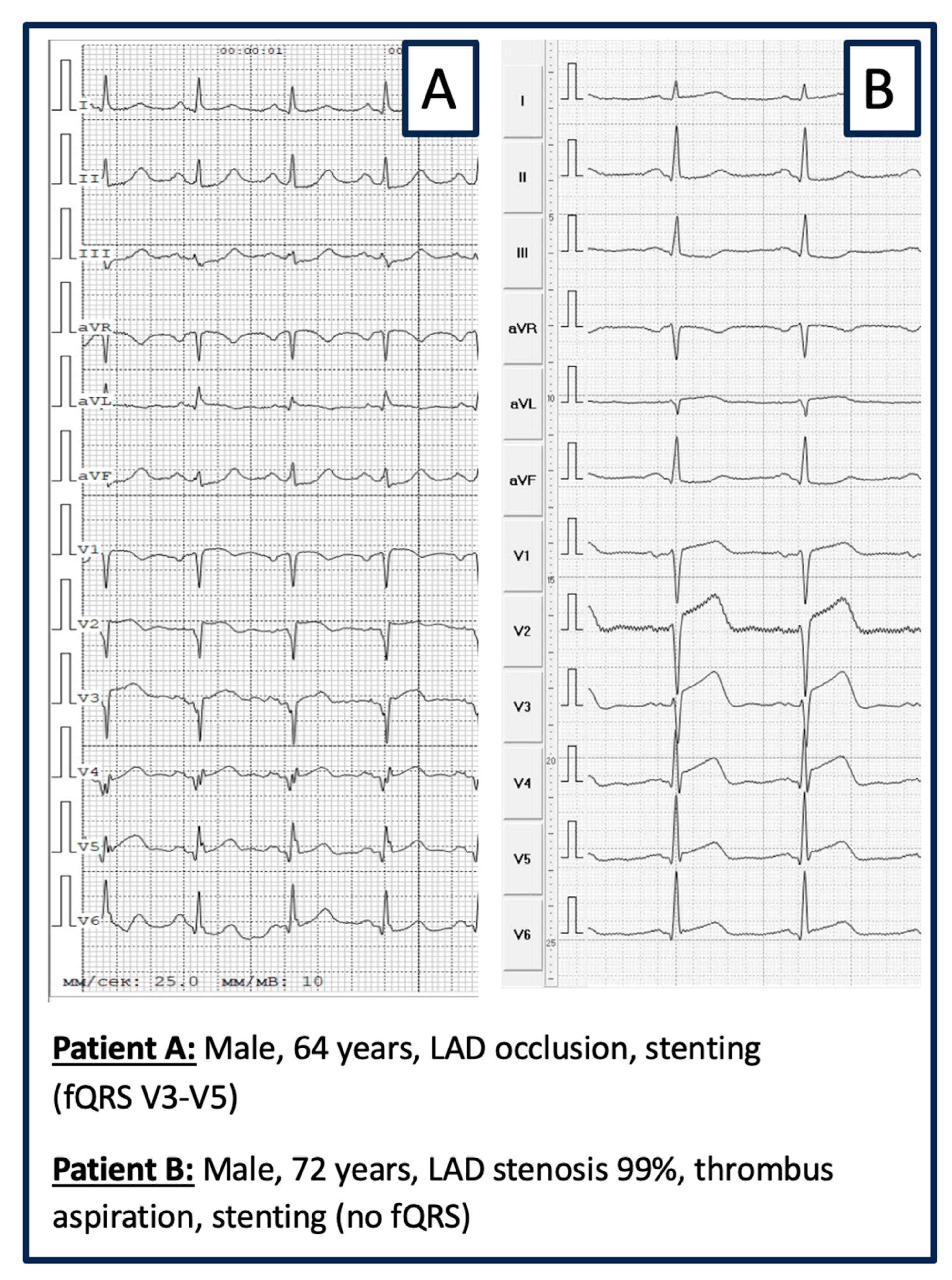 - ELECTROGRAM ANALYSIS: The ECG was recorded on ECG GE MAC 1200 ST, 12-channels: filters from 0.16 to 100 Hz; AC filter 60 Hz, ECG speed 25 mm/s, voltage 10 mm/mV. ECG evaluation regarding fQRS was performed visually by 2 experienced cardiologists blinded to the patient’s medical records and history. Inter-observer consensus regarding the presence of fQRS was mandatory. fQRS was defined as visible notching of the R- or S-wave in at least 2 contiguous leads (same coronary perfusion territory) in a routine 12-lead ECG (Figure 2) [20].