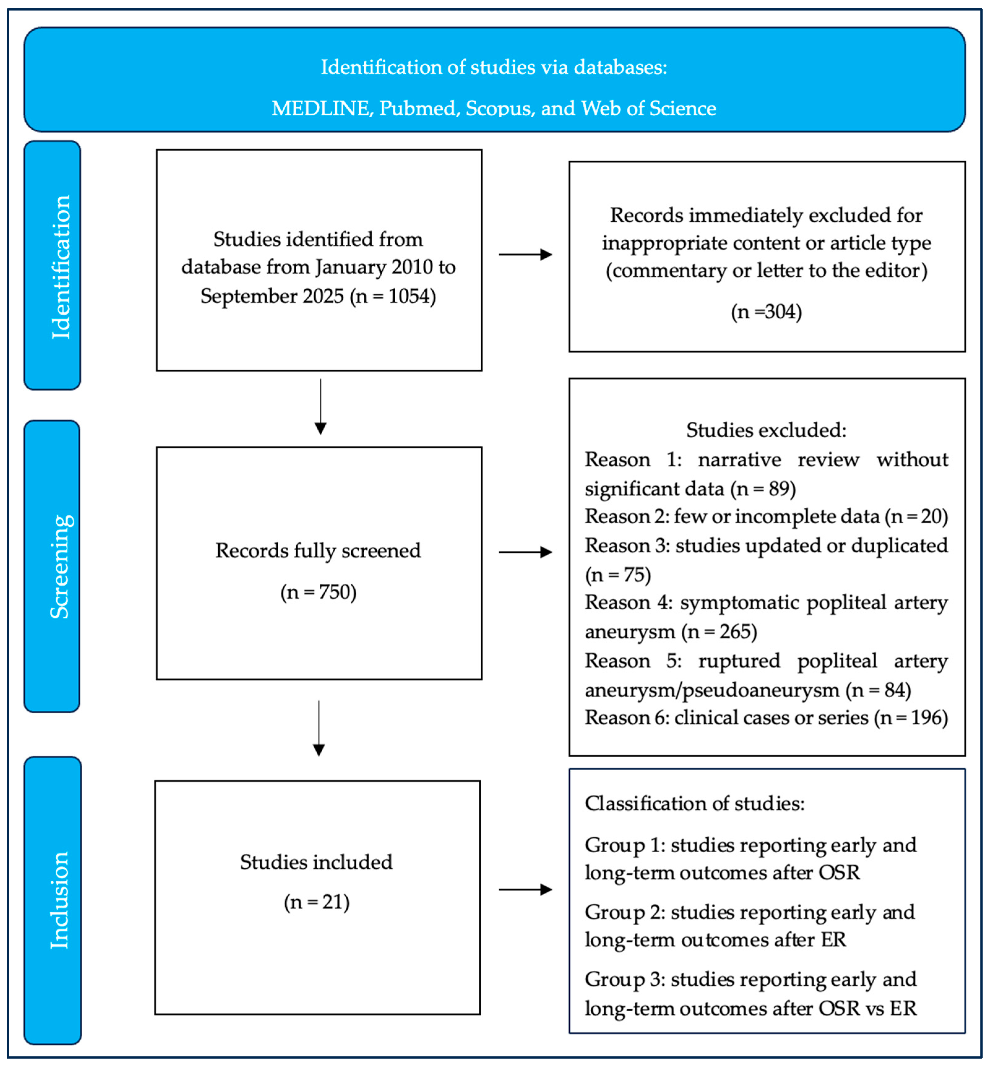 - Ripepi, M.; Gibello, L.; Ferrero, E.; Scevola, M.; Manzo, P.; Varetto, G.; Quaglino, S.; Chiera, L.; Boero, M.; Ferri, M.; et al. Open Versus Endovascular Repair of Patent Popliteal Artery Aneurysms in an Elective Setting: A Multicenter Retrospective Study with Long-Term Follow-Up. Ann. Vasc. Surg. 2025, 117, 64–71. [Google Scholar] [CrossRef] [PubMed]
