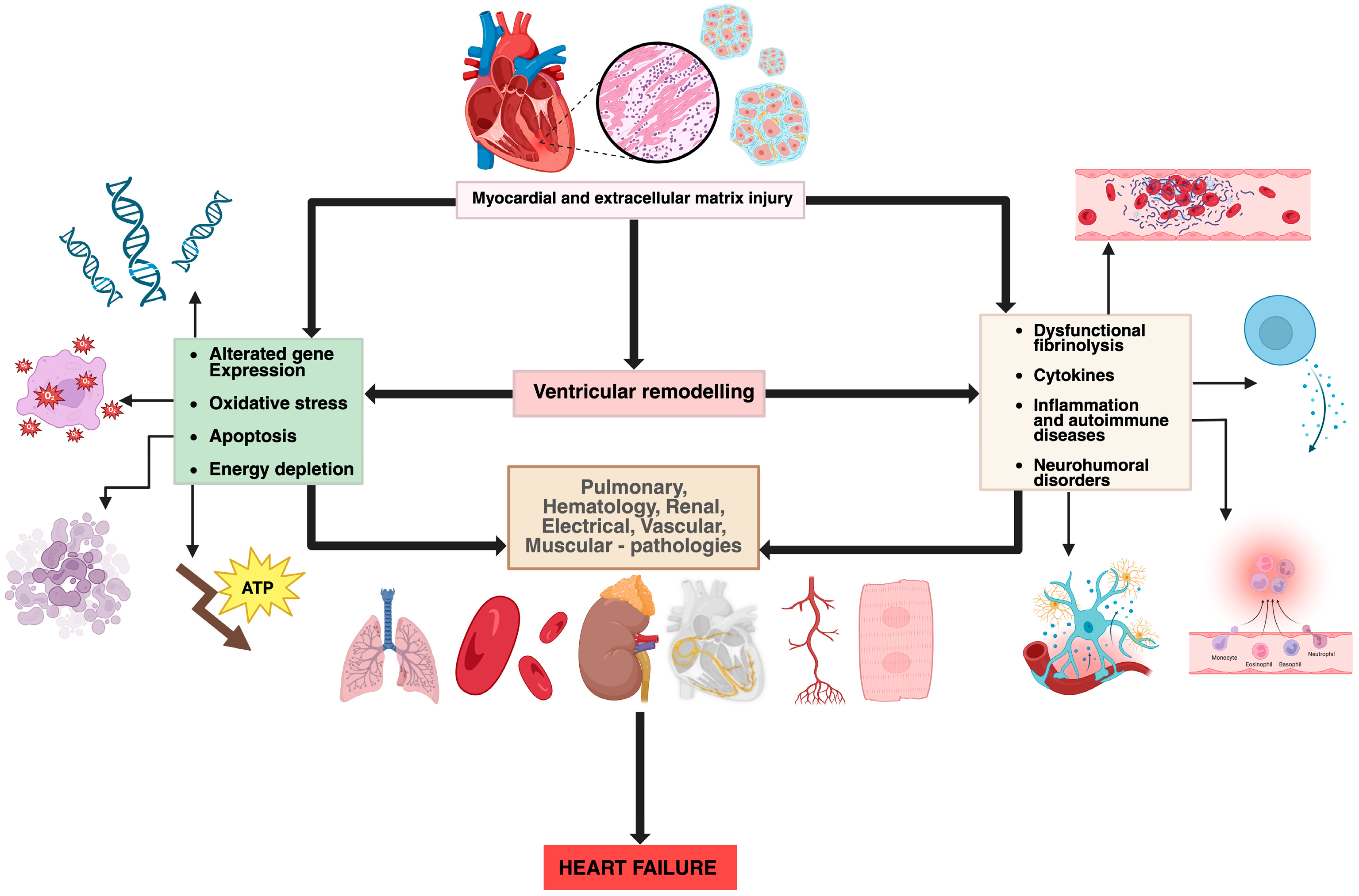 Pathophysiological mechanisms involved in heart failure (original figure created by Manole Martin with BioRender) [