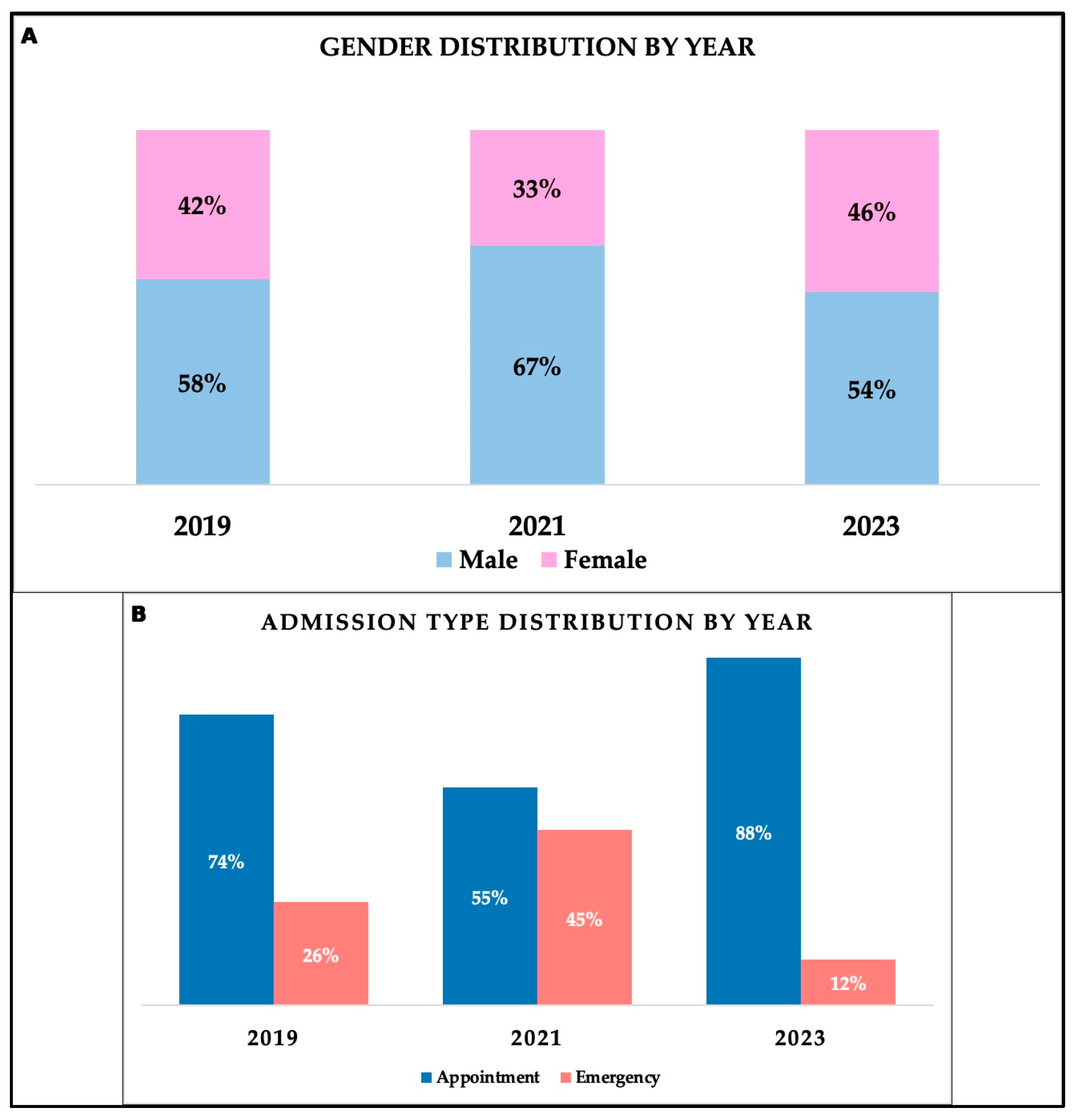 18]. As a comparison, females in our study had a median age of 72 years. Patients’ distribution by environment of origin was relatively balanced, with 205 patients originating from rural areas and 201 from urban areas, a pattern consistent across study years. Admission was either by appointment (72.91%) or through the emergency department (27.09%). During the pandemic period, significant differences regarding admission type were observed (
