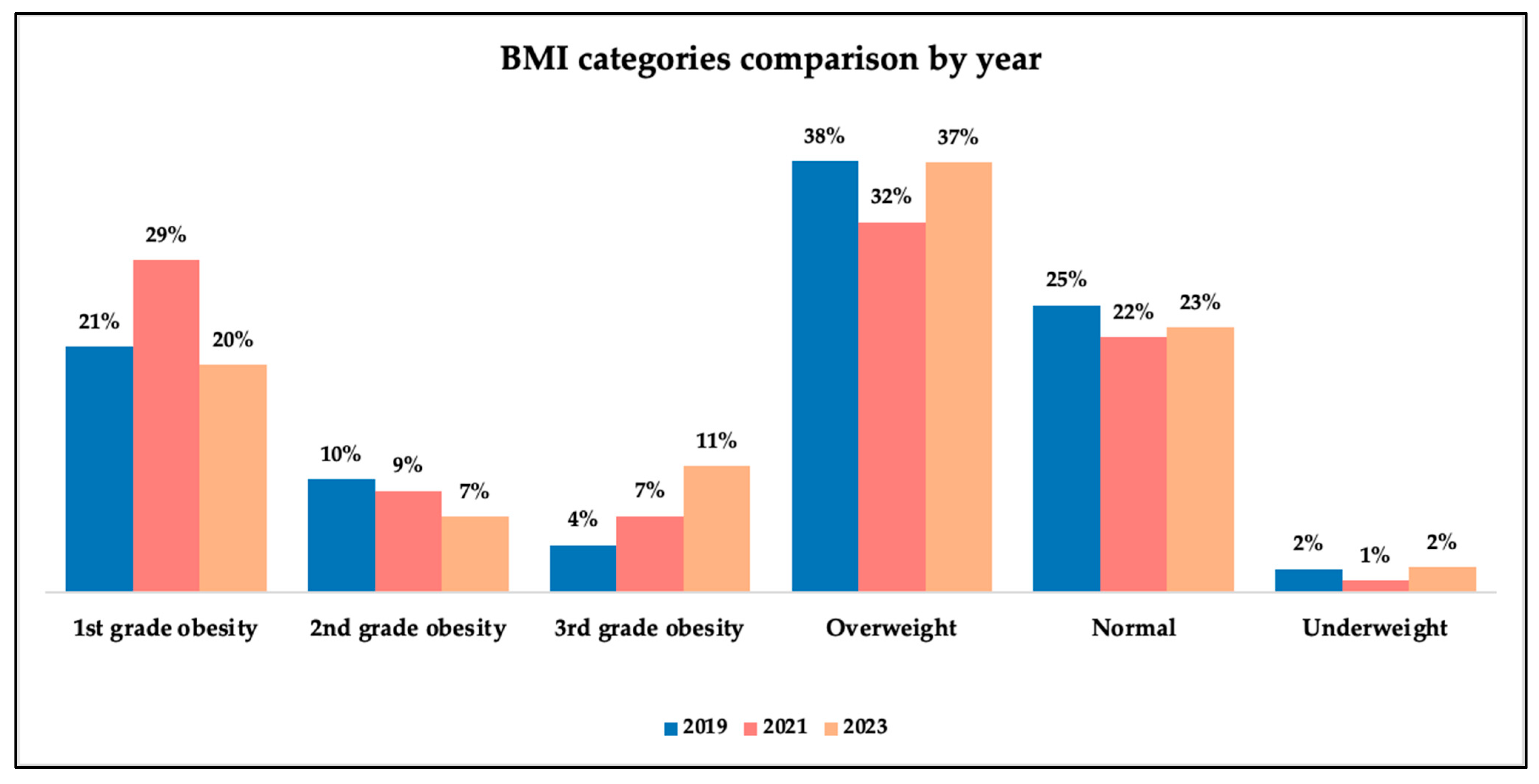 p = 0.003), and lower values in 2023 (665 pg/mL). For women, significant differences were identified between 2019 and 2023 (