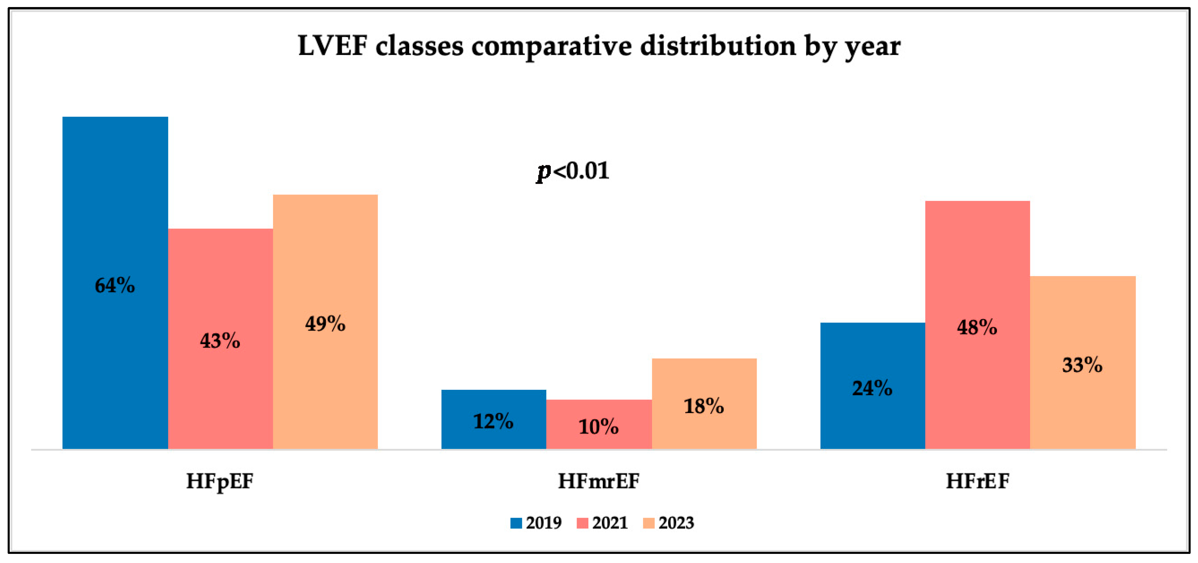 Analyzing patients’ LVEF values, we observed different distributions of LVEF classes by year and gender. We observed that men had significantly lower LVEF values and emergency-admitted patients also exhibited lower values, with a difference of 10% compared to appointment admissions. As has been shown, emergency admissions saw a rise during the pandemic, and alongside this, we observed a decrease in LVEF values throughout the same timeframe. These trends mirror results from recent medical studies, which support an increase in the proportion of patients with lower systolic function during the pandemic, associated with a decrease in those with preserved systolic function and stability in the percentage of patients in the intermediate class over time [