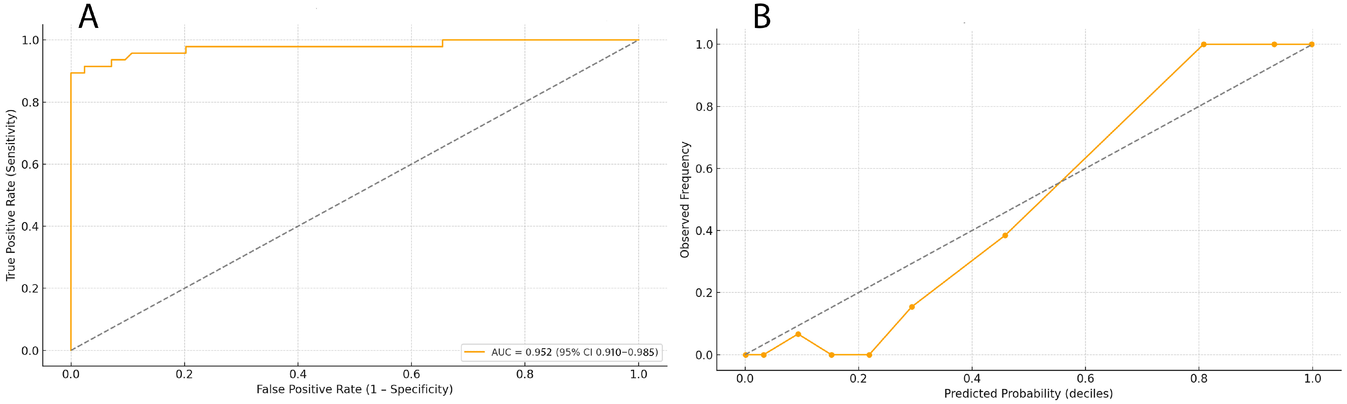 Figure 2). Panel A shows the Receiver Operating Characteristic (ROC) curve for the penalized logistic regression (Elastic Net) model, which achieved excellent discrimination with an AUC of 0.952 (95% CI 0.910–0.985). The ROC analysis confirmed stable separation between patients with and without postoperative atrial fibrillation (POAF) across nested cross-validation folds, indicating minimal optimism in model performance. Panel B presents the calibration curve derived from out-of-fold (OOF) predictions. The model exhibited good agreement between predicted and observed POAF probabilities (calibration slope = 0.94, intercept = −0.02, Hosmer–Lemeshow