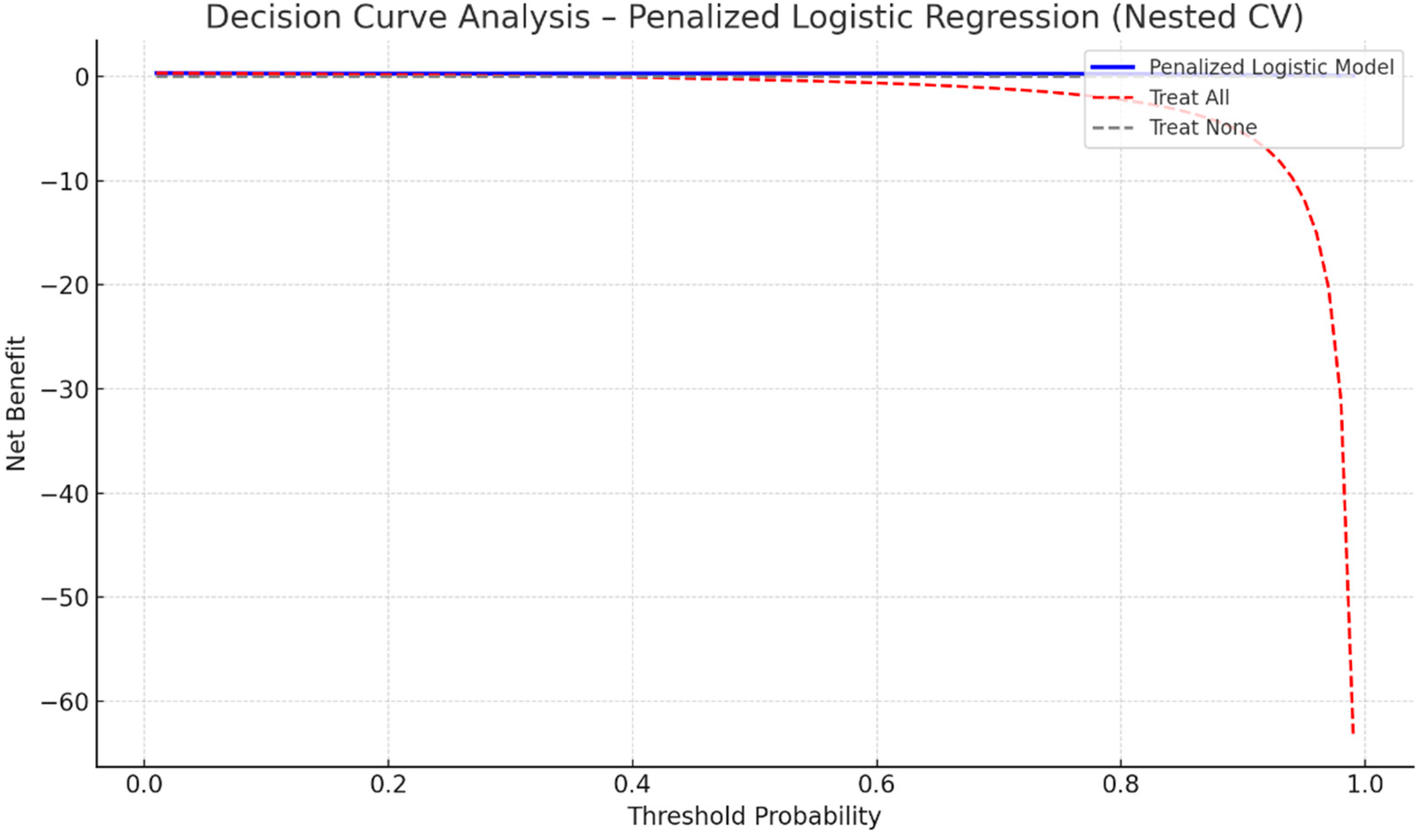 Figure 3 presents the Decision Curve Analysis (DCA) for the penalized logistic regression model. The model demonstrates a consistent positive net clinical benefit across a broad range of threshold probabilities (approximately 0.15–0.55) compared with “treat-all” and “treat-none” strategies. This suggests that utilizing the model to inform postoperative rhythm monitoring and preventive management may yield superior clinical outcomes within realistic risk thresholds. The curve is based exclusively on out-of-fold (OOF) predictions from nested cross-validation, confirming internal robustness of the net benefit estimation.