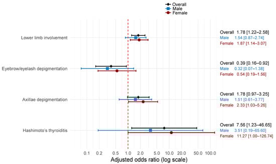 The multiple regression analysis revealed important sex-specific differences in clinical associations. Among females, family history was significantly associated with lower-limb involvement (aOR = 1.87), axillary depigmentation (aOR = 2.33), and Hashimoto thyroiditis (aOR = 11.27). In contrast, these associations were attenuated and nonsignificant in males.