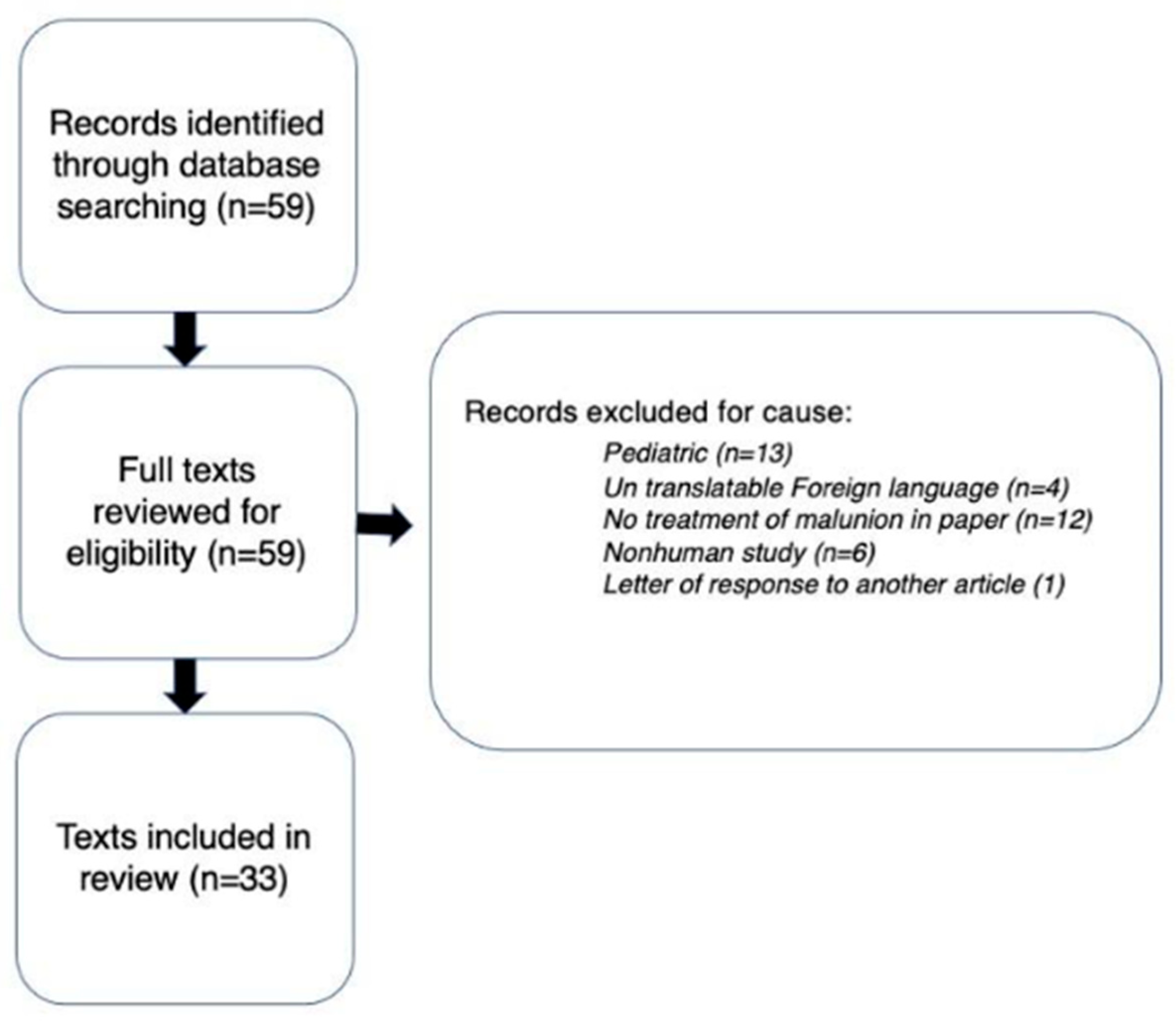 An extensive search was conducted on PubMed with the key terms “femur” OR “femoral”, AND “malunion”, AND “osteotomy” OR correction to be included in the article title. At the time, the literature search yielded a total of 59 relevant articles available for review. Four of the articles were excluded based on being written in a non-English language with no available translation. Thirteen articles were discarded because they only included pediatric patients. Six articles were excluded for utilizing non-human subjects. One was excluded as it was a response letter to another article. This left a total of 33 articles. Referential analysis provided additional relevant research material (Figure 1). Every article included was in the format of either a case series (Level 4 evidence), or a case report (Level 5 evidence).