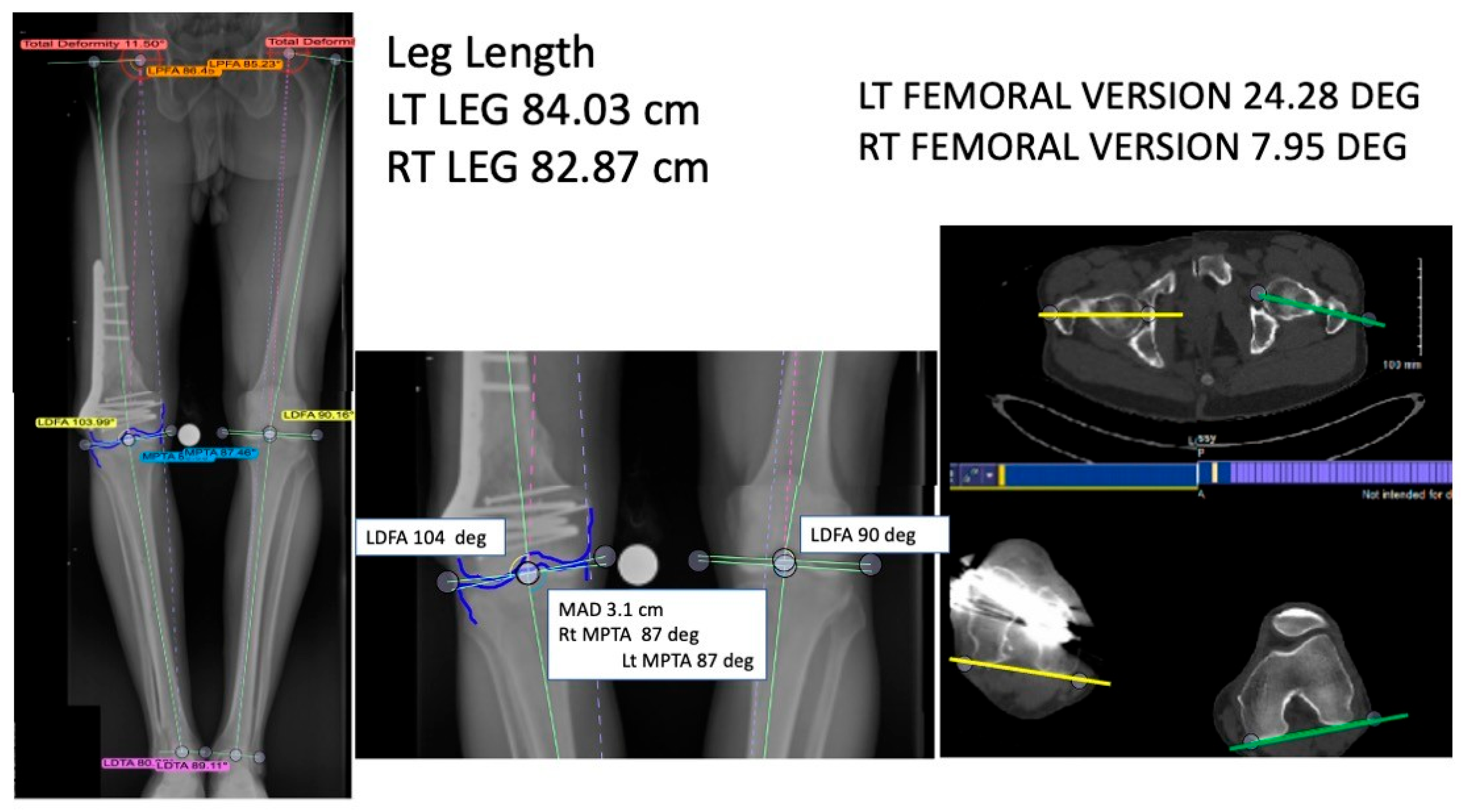 Figure 2. Radiographic and computed tomography assessment of femoral malunion. The left image displays a full-length standing radiographs and CT scans demonstrating deformity analysis in a patient with femoral malunion. In the middle image, mechanical axis deviation (MAD), lateral distal femoral angle (LDFA), and medial proximal tibial angle (MPTA) are measured to evaluate coronal alignment and leg length discrepancy (left leg: 84.03 cm; right leg: 82.87 cm). The Axial CT images on the right show femoral version differences (left 24.28°, right 7.95°), highlighting rotational malalignment. These imaging modalities assist in quantifying angular, rotational, and length deformities prior to corrective planning.