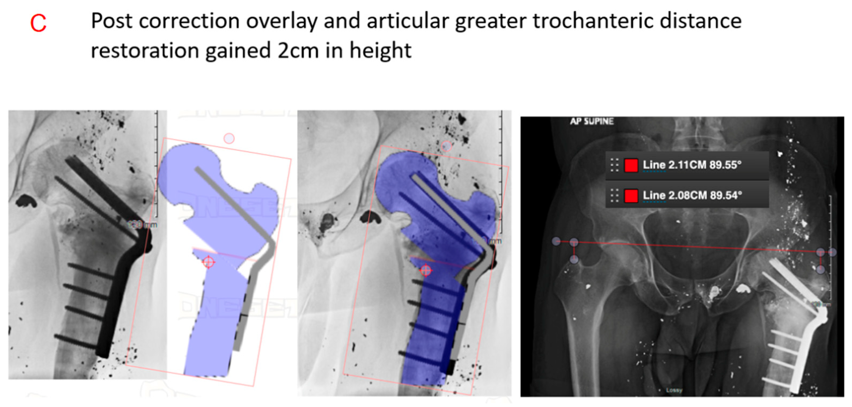 Figure 3. Stepwise correction of intertrochanteric femoral malunion using valgus intertrochanteric osteotomy (VITO). (A) Preoperative radiographs demonstrating varus deformity with a decreased femoral neck–shaft angle (125.99°), altered articular trochanteric distance, and femoral version difference of 22.34°. (B) Preoperative plan showing a 30° valgus intertrochanteric osteotomy with 22° derotation, performed via a transverse cut followed by wedge removal. (C) Post-correction images illustrating restoration of femoral version, neck–shaft alignment, and trochanteric height, resulting in anatomic reconstruction and 2 cm limb length restoration.