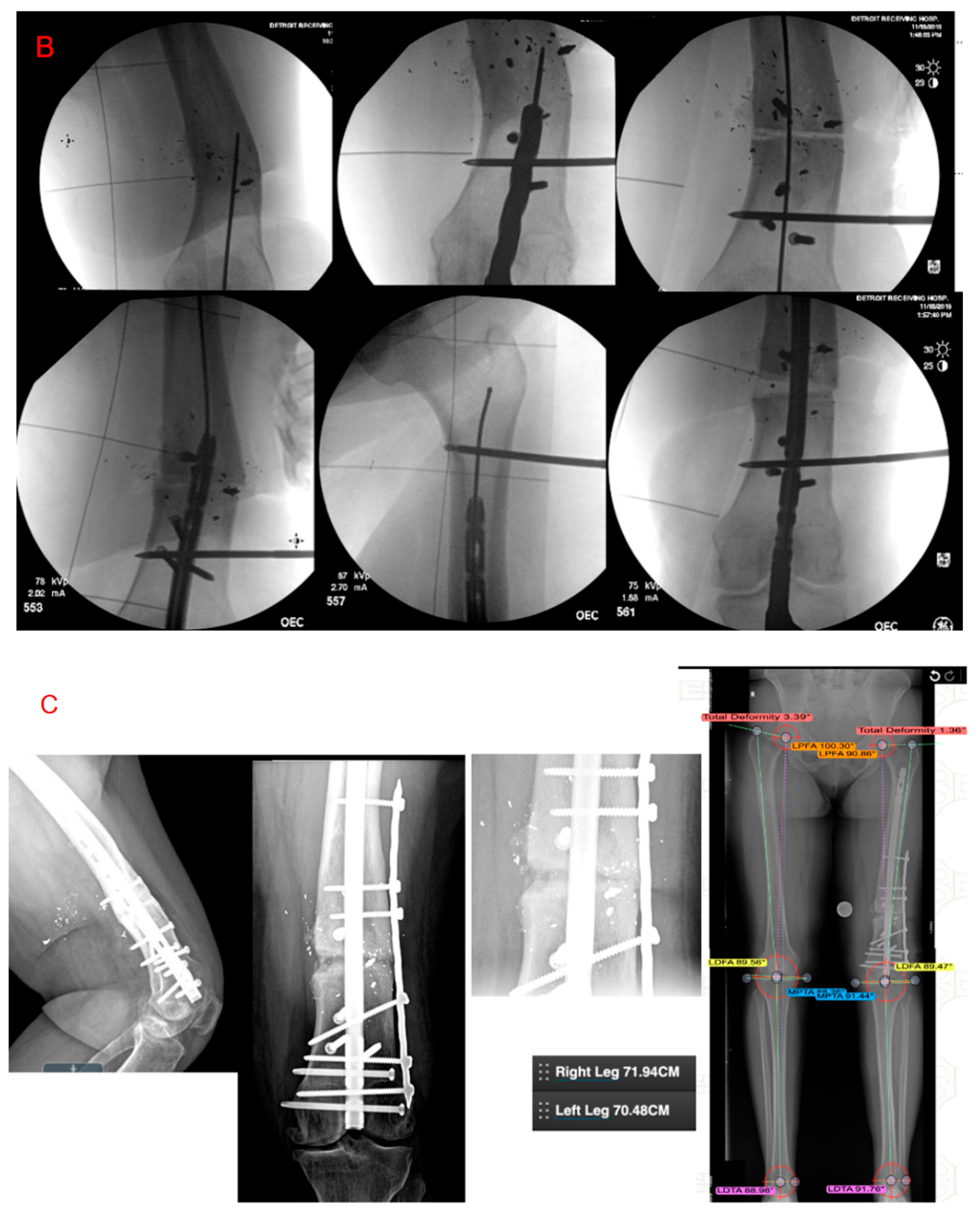 63. Kempfe, I.; Grosse, A.; Abalo, C. Locked Intramedullary Nailing: Its Application to Femoral and Tibial Axial, Rotational, Lengthening, and Shortening Osteotomies. Clin. Orthop. Relat. Res. 1986, 212, 165–173. [Google Scholar] [CrossRef]
