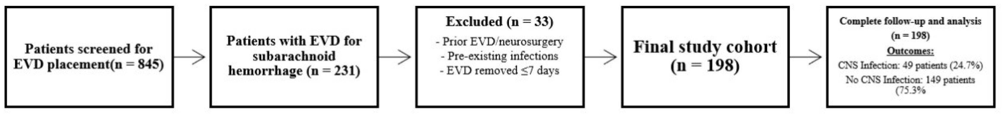 Chicago/Turabian StyleSarkis, Hraq, Abed Alrazzak Kerhani, Ann-Kathrin Joerger, Carolin Albrecht, Chiara Negwer, Maria Wostrack, Arthur Wagner, and Bernhard Meyer. 2025. "EVD-Associated Infections in Subarachnoid Hemorrhage: Risk Factors and Clinical Predictions—A Retrospective Single-Center Study" Medicina 61, no. 11: 2058. https://doi.org/10.3390/medicina61112058