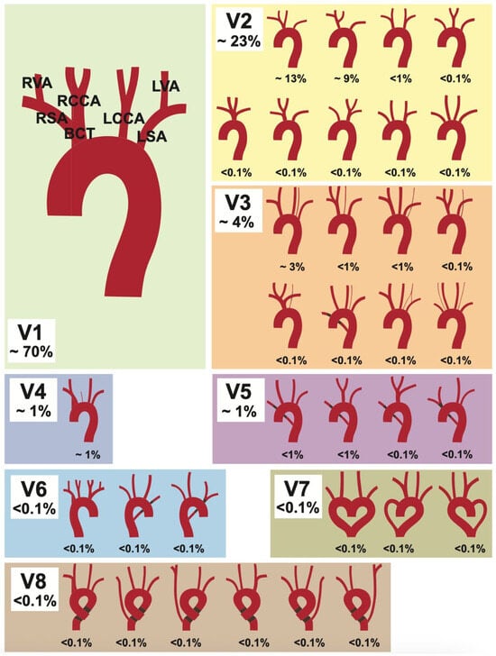 Lippert’s 1967 classification [] for aortic arch variability. Depicted are the eight variation types (V1–V8), with their subgroups. Figure adapted from [].
