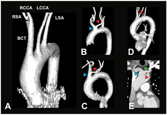 Most common AA variations. (A) Exemplary 3D reconstruction of a CTA in a 69-year-old female patient. Depicted is the most common variant of the branches of the aortic arch (V1). BCT—brachiocephalic trunk, RSA—right subclavian artery, RCCA—right common carotid artery, LSA—left subclavian artery, LCCA—left common carotid artery. (B) Exemplary 3D reconstruction of a CTA in a 66-year-old female patient. Depicted is a BCT variation (blue arrow), where the LCCA (red arrow) originates off the BCT in the vicinity of the aortic arch (V2a). (C) Exemplary 3D reconstruction of a CTA in a 90-year-old female patient. Depicted is a BCT variation (blue arrow), where the LCCA (red arrow) originates from a longer BCT (V2b). (D) Exemplary 3D reconstruction of a CTA in a 71-year-old male patient. Depicted is a direct origin of the left vertebral artery (LVA, red arrow) out of the aortic arch; all other arteries originate similarly as in the most common variant (V3a). (E) Paracoronal CTA in an 80-year-old male patient. Depicted is a direct origin of the left vertebral artery (LVA, red arrow) out of the aortic arch, in combination with a brachiocephalic trunk variation (blue arrow), where the LCCA (green arrow) originates from the BCT (V3b).