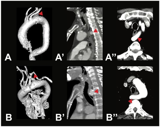 Most symptomatic AA variations—arteria lusoria. Depicted are two exemplary cases of arteria lusoria (V5) in a 71-year-old male patient (A—3D reconstruction, A’—sagittal view, A’’—axial view) and a 79-year-old female patient (B—3D reconstruction, B’—sagittal view, B’’—axial view). In both cases, the RSA (red arrow) was the last branch of the AA, originating from its left side and running posterior to the esophagus to the right side.