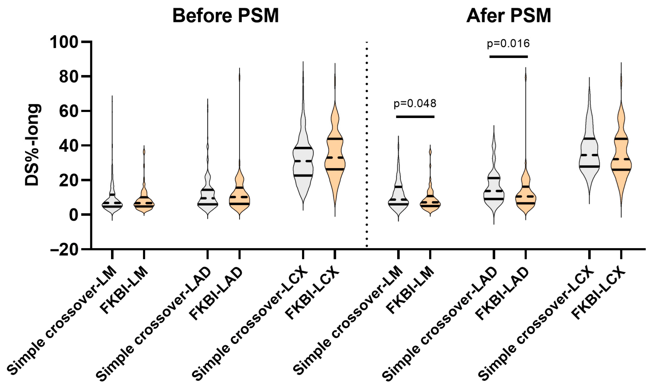| DS%-long in LCX | 31 (22.6–38.6) | 33.1 (26.2–43.9) | 0.083 | 34.5 (27.9–44) | 32.1 (26–43.9) | 0.293 |