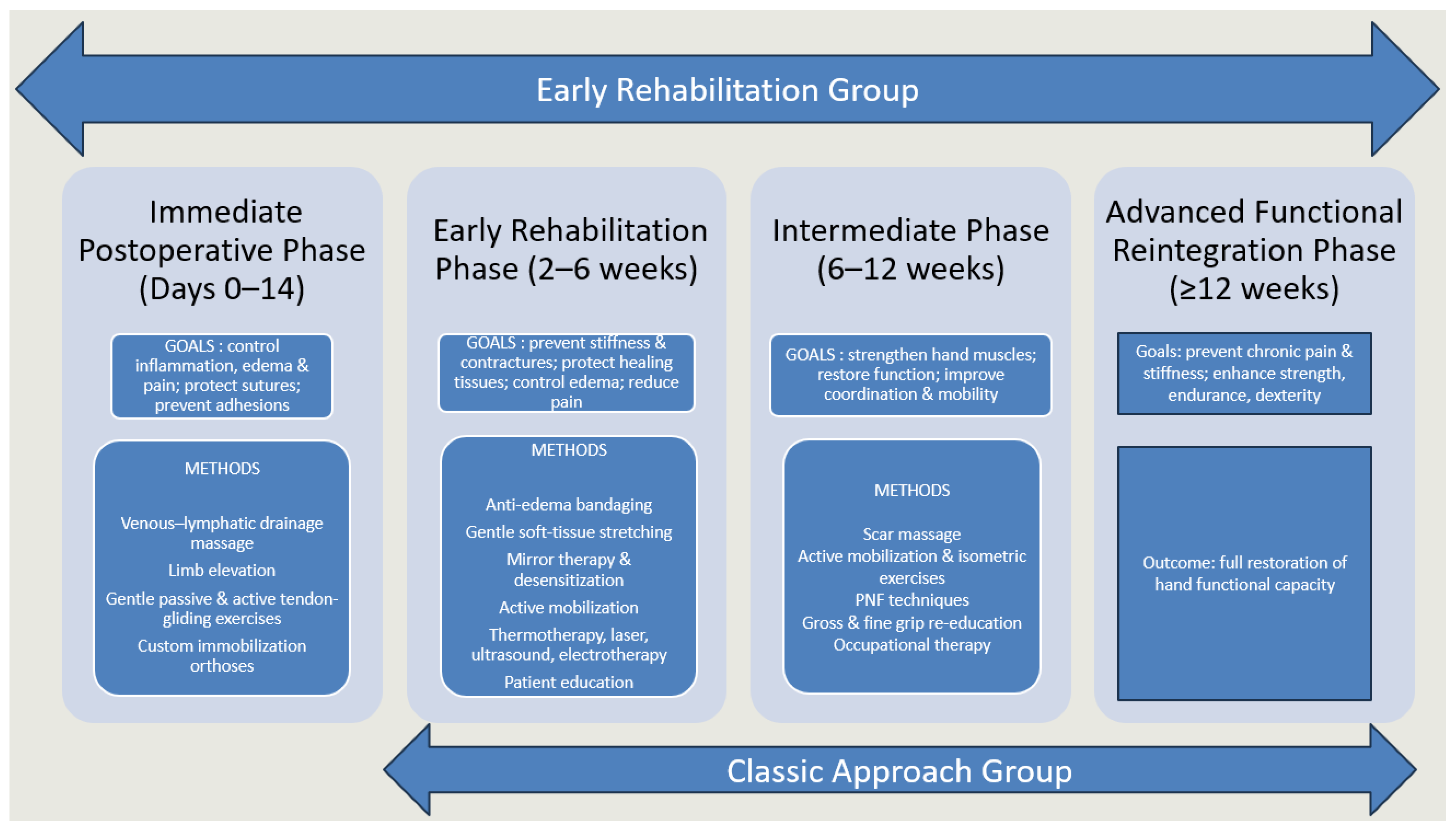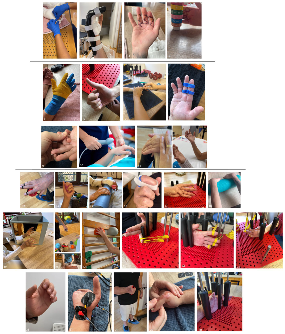 - Intermediate phase (6–12 weeks): The objectives in this stage were to consolidate early gains, progressively strengthen the hand and improve dexterity and proprioception. Active free mobilization and isometric strengthening exercises were intensified, while neuroproprioceptive facilitation techniques addressed motor control and coordination. Progressive resistance training and stretching helped restore muscle endurance and joint flexibility. Ergotherapy was introduced to retrain fine and gross motor grips in functional contexts, preparing patients for daily activities. Continued use of customized orthoses was recommended when needed, particularly to maintain joint mobility and alignment or to counteract early stiffness. Mirror therapy and desensitization could be maintained for patients with persistent sensory disturbances.