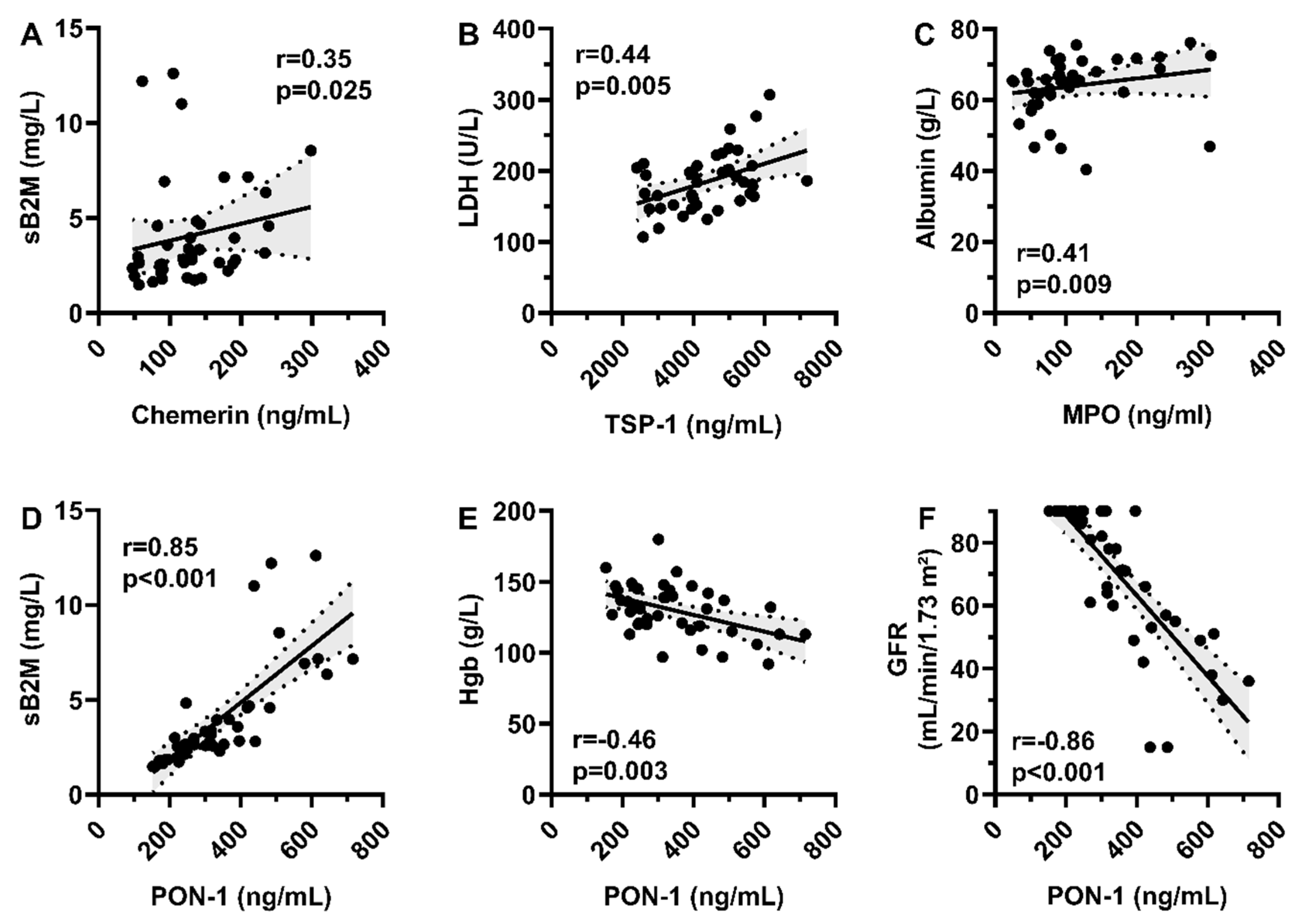 PON-1 demonstrated a positive correlation with sB2M (r = 0.85, p < 0.001), along with negative correlations with hemoglobin (r = −0.46, p = 0.003) and GFR (r = −0.86, p < 0.001) (Figure 2D–F).