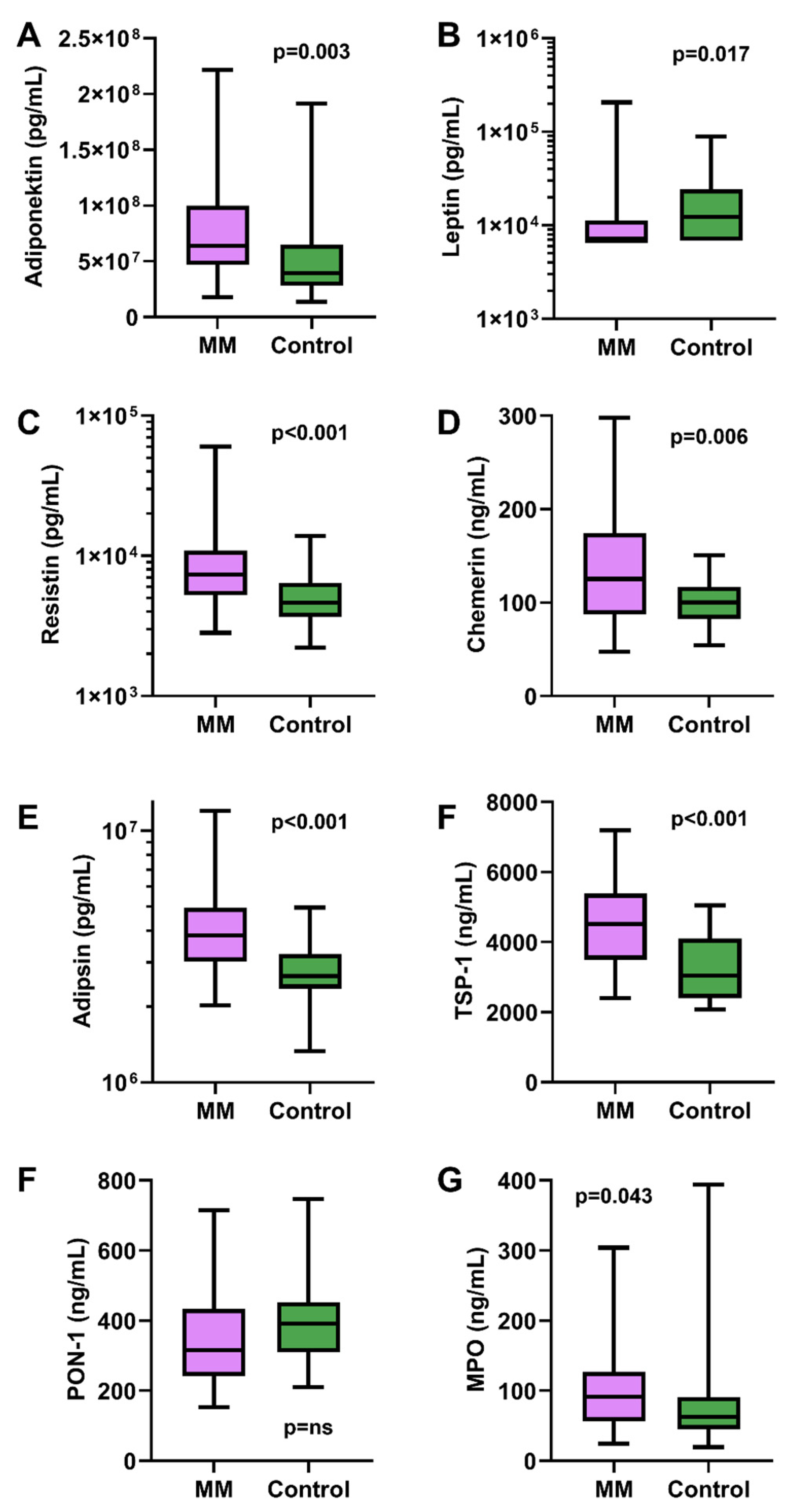 Figure 3. Serum adipokine levels of multiple myeloma patients and healthy controls (AG). MM—multipe myeloma; TSP-1—thrombospondin-1; MPO—myeloperoxidase; PON-1—paraoxanase; mg—milligram; L—litre; U—unit; g—gram; mL—millilitre; min—minute; m—metre; ns—not significant.