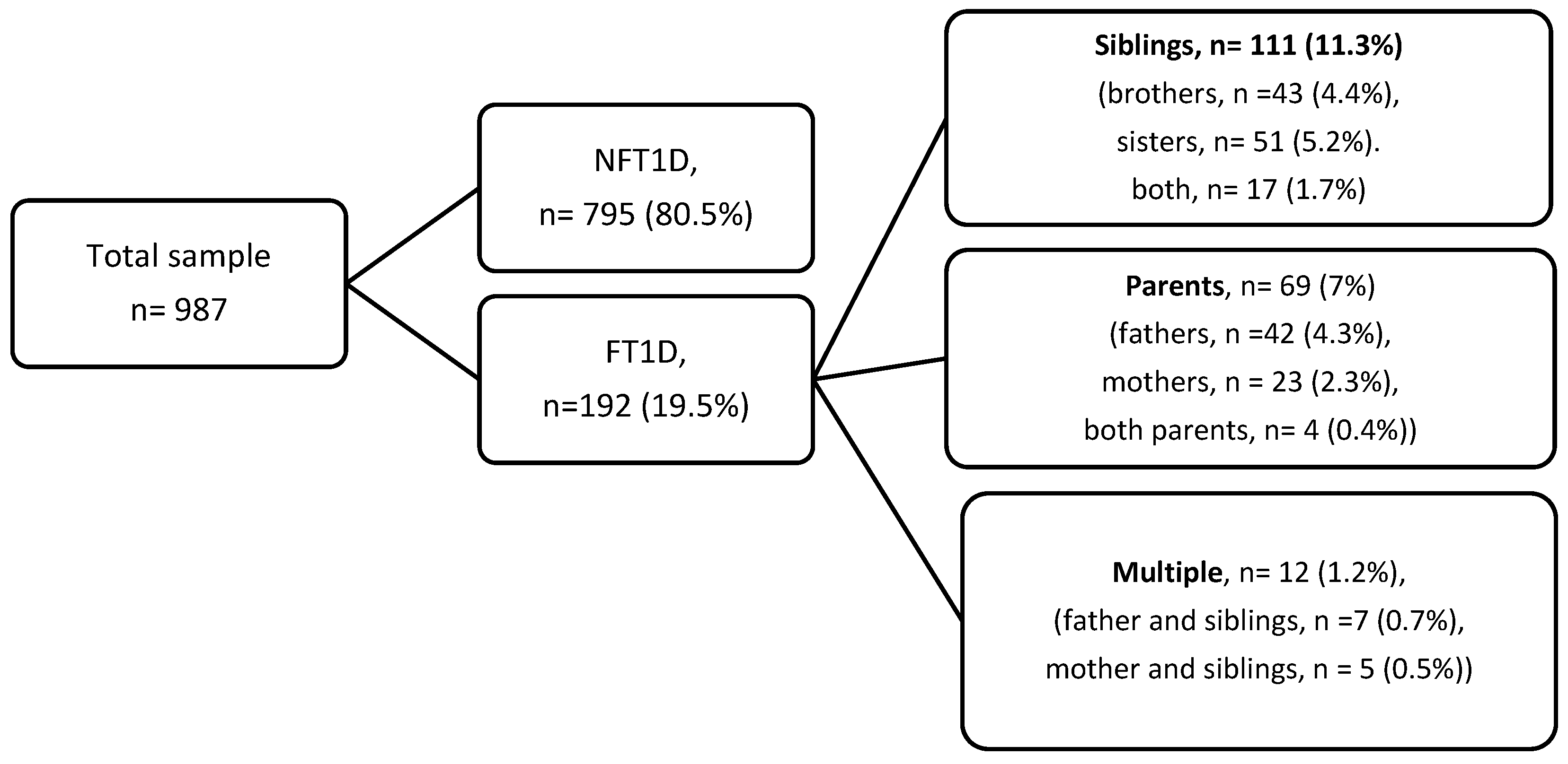 - Karges, B.; Prinz, N.; Placzek, K.; Datz, N.; Papsch, M.; Strier, U.; Agena, D.; Bonfig, W.; Kentrup, H.; Holl, R.W. A comparison of familial and sporadic type 1 diabetes among young patients. Diabetes Care 2021, 44, 1116–1124. [Google Scholar] [CrossRef] [PubMed]