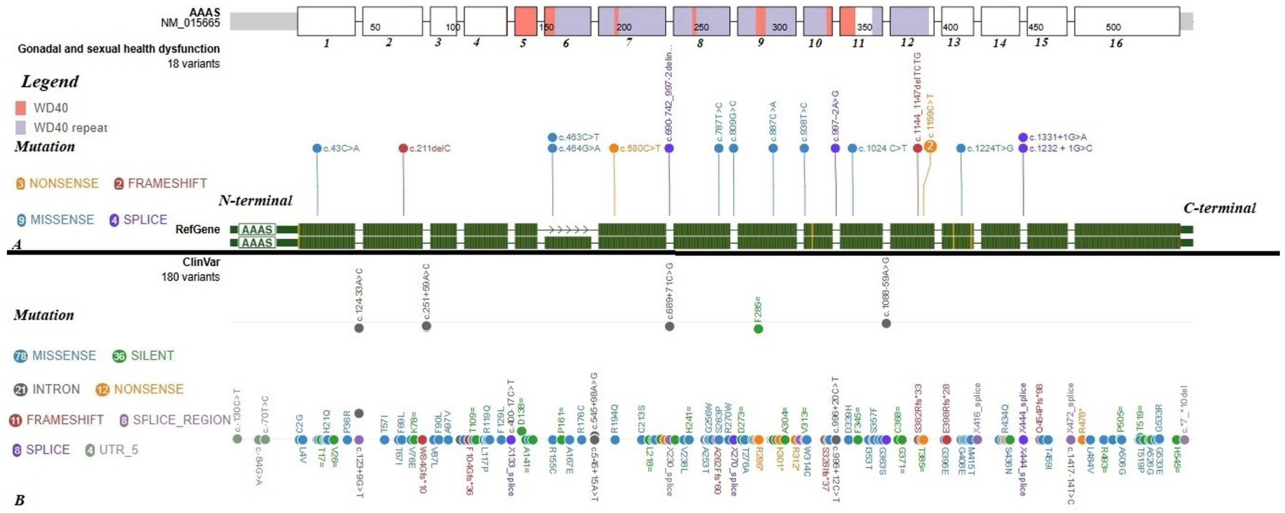 - Handschug, K.; Sperling, S.; Yoon, S.J.; Hennig, S.; Clark, A.J.; Huebner, A. Triple A syndrome is caused by mutations in AAAS, a new WD-repeat protein gene. Hum. Mol. Genet. 2001, 10, 283–290. [Google Scholar] [CrossRef]