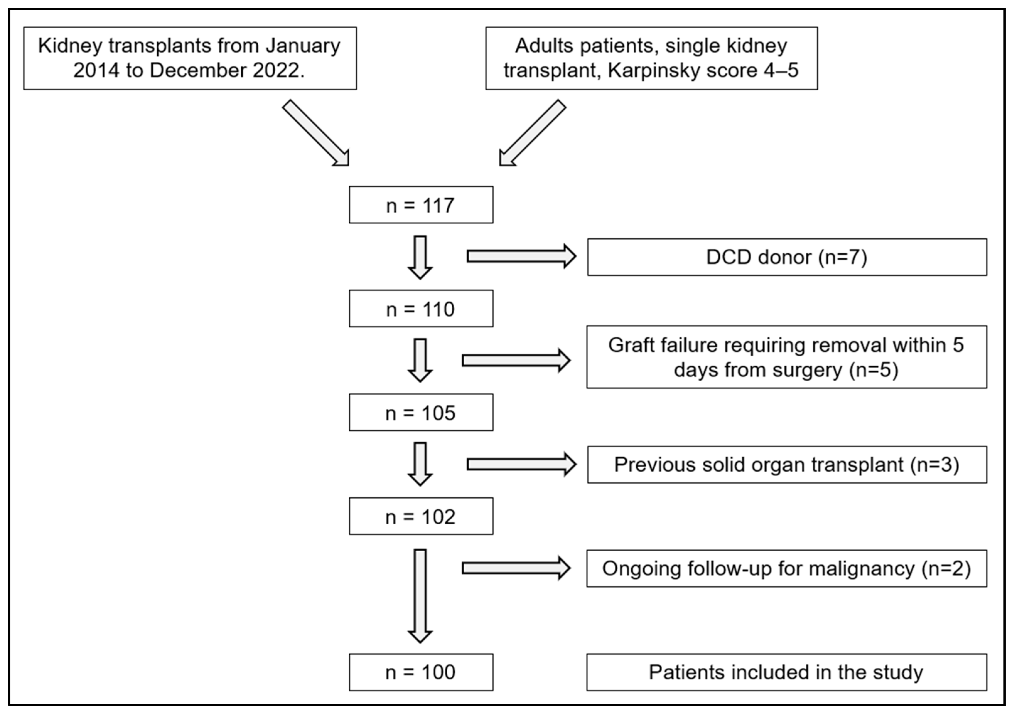 This is a retrospective study analyzing data from 100 patients who underwent single KT with a graft with a Karpinski score of 4 or 5 between January 2014 and December 2022 at the Department of General Surgery and Kidney Transplantation of the Azienda Ospedaliero-universitaria Senese. The inclusion criteria necessitated that patients were adults who had received a deceased donor graft with a Karpinski score of 4 or 5 upon biopsy, and had undergone a single-kidney transplantation. Exclusion criteria for this study included transplants with grafts from donors after cardiac death (DCD) (n = 7), graft failure requiring removal for any reason (e.g., thrombosis of the vein or artery) within five days of the procedure (n = 5), a history of solid organ transplants (n = 3), and ongoing follow-up (FU) for past malignancy (n = 2). The selection criteria used in the study are shown in Figure 1.