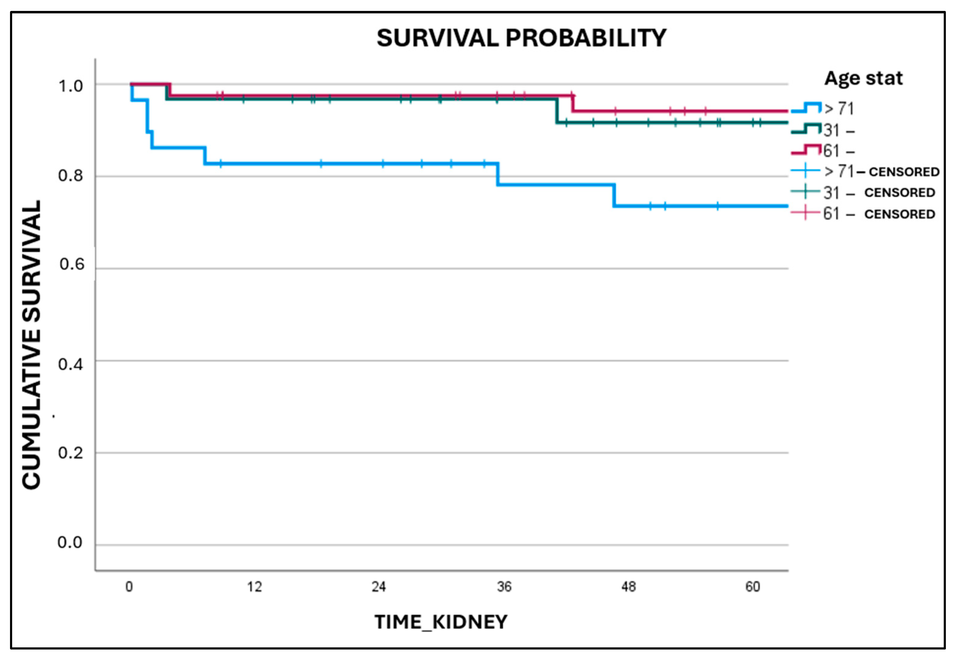 Similarly, no significant variations were observed in the occurrence and duration of DGF, cessation of function, and mortality. The 5-year survival rate for recipients of Karpinski score 4 grafts was 96.5% ± 2.5 Standard Error (SE), while recipients of Karpinski score 5 grafts had a survival rate of 93.8% ± 4.2 SE. The survival curves did not show a statistically significant difference (p = 0.987) based on the log-rank Mantel–Cox test (Supplementary Materials Figure S1). Grafts with a Karpinski score of 4 had a 5-year survival rate of 87.9% ± 4.4 SE, while grafts with a Karpinski score of 5 had a 5-year survival rate of 86.6% ± 6.4 SE. The log-rank Mantel–Cox test showed no significant difference between the survival curves (p = 0.857) (Supplementary Materials Figure S2). A study was conducted to evaluate graft survival based on the age of the donor. The study used three age groups for the donors: 31–60, 61–70, and 71 years or older. The results showed a statistically significant decrease in 5-year graft survival for donors aged 71 years or older (p = 0.010) (Figure 2).