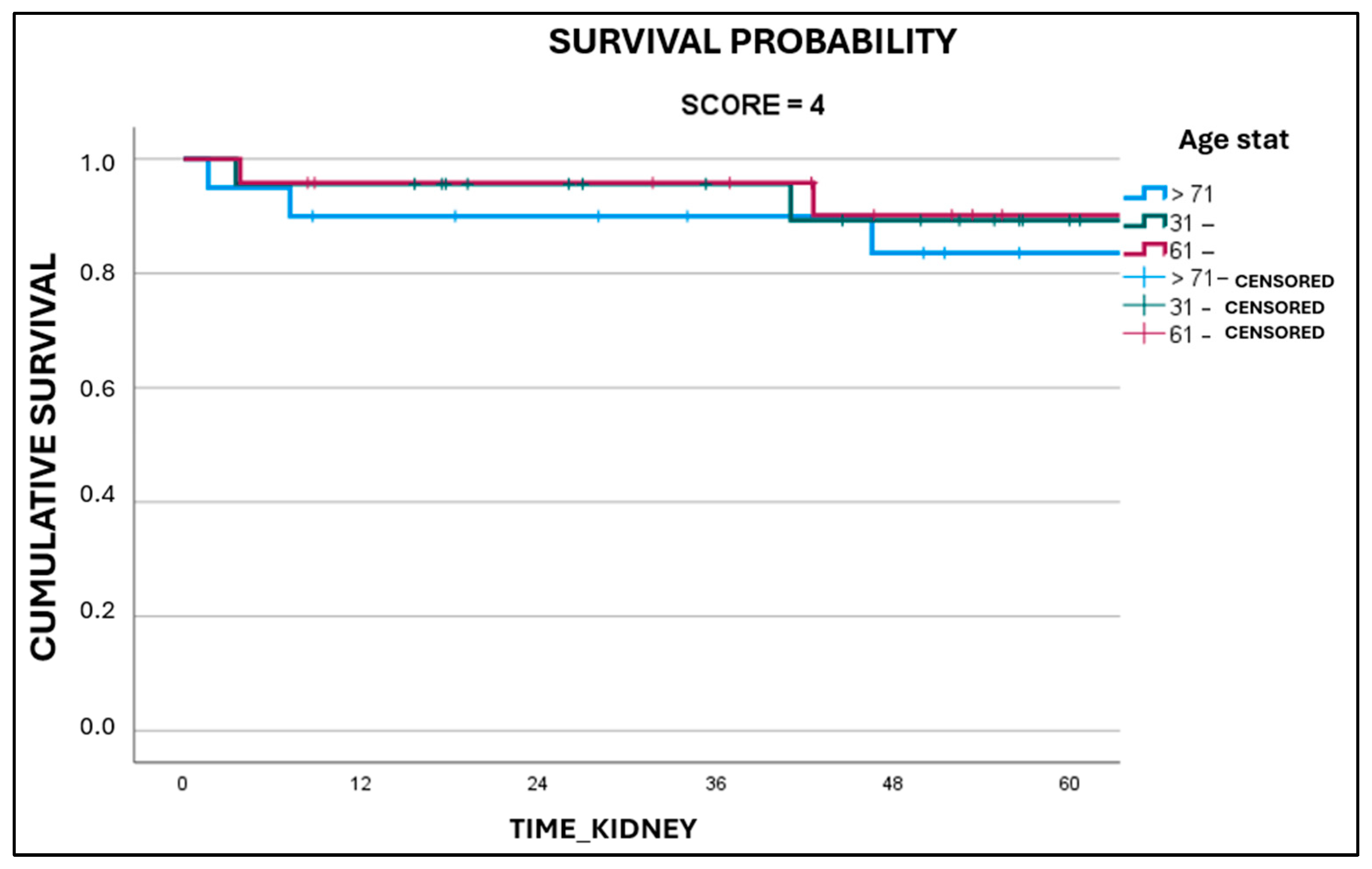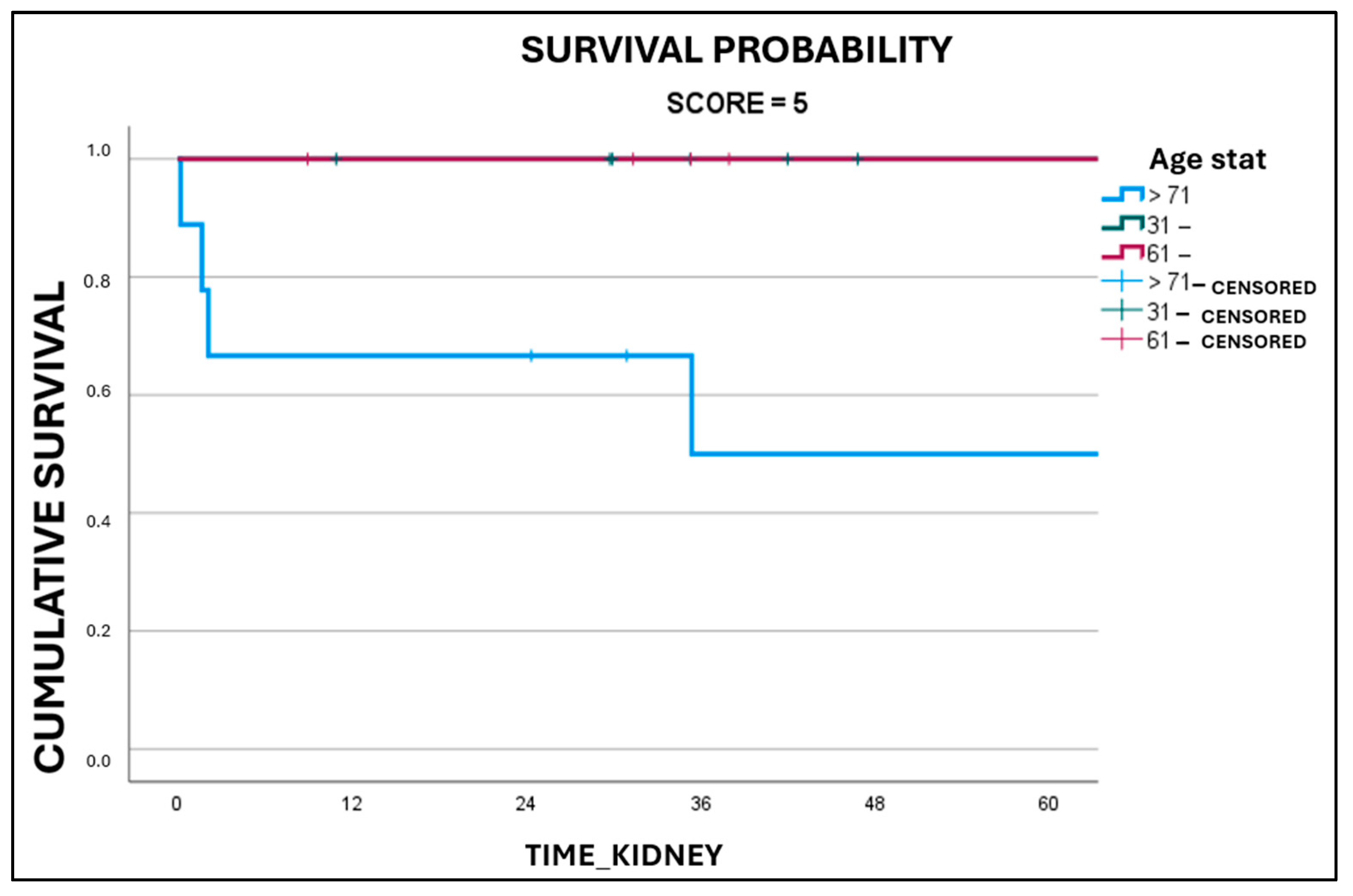 Upon analyzing separately grafts with Karpinski scores of 4 (Figure 3) and 5 (Figure 4) according to their respective donors’ age, it was discovered that grafts with a Karpinski score of 5, harvested from donors older than 70 years of age, had a statistically significant worse survival (p = 0.014).