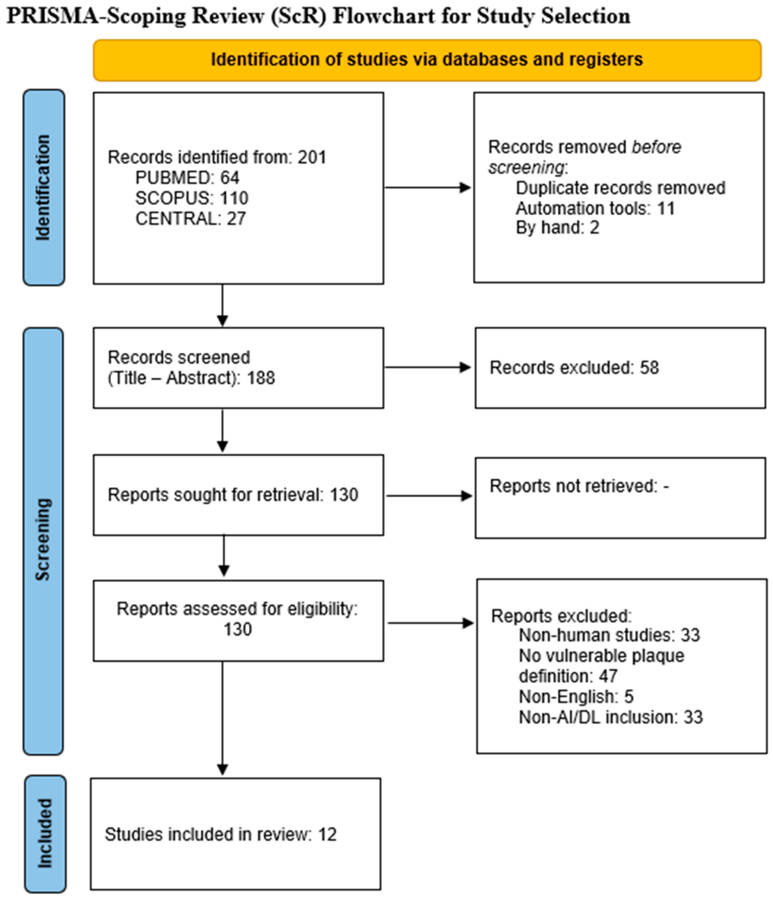 APA StyleBarbatis, A., Dakis, K., Nana, P., Kouvelos, G., Matsagkas, M., Giannoukas, A., & Spanos, K. (2025). Application of Artificial Intelligence in Vulnerable Carotid Atherosclerotic Plaque Assessment—A Scoping Review. Medicina, 61(12), 2082. https://doi.org/10.3390/medicina61122082