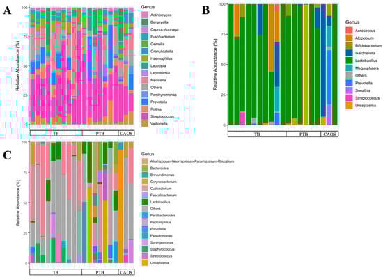 Oral, vaginal, and placental microbial community structures in term birth (TB), preterm birth (PTB), and CAOS groups. Stacked bar plots show the relative abundance (%) of bacterial genera in each sample, grouped from the term birth (TB), preterm birth (PTB), and CAOS groups. (A) Oral microbiota composition showing the top 15 genera (TB: n = 10, PTB: n = 7, CAOS: n = 3). (B) Vaginal microbiota composition showing the top 10 genera (TB: n = 10, PTB: n = 6, CAOS: n = 3). (C) Placental microbiota composition showing the top 15 genera (TB: n = 10, PTB: n = 7, CAOS: n = 3). Each vertical bar represents an individual sample. Genera not included in the top taxa are categorized as “Others”.