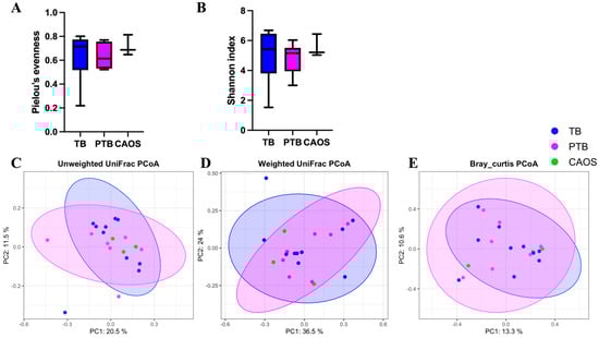 Alpha and beta diversity analyses of the vaginal microbiota in term birth (TB), preterm birth (PTB), and CAOS groups (TB: n = 10, PTB: n = 6, CAOS: n = 3). (A,B) Alpha diversity indices. (A) Shannon index (all q = 0.612; Cliff’s delta = TB vs. CAOS: −0.200, TB vs. PTB: 0.300, PTB vs. CAOS: −0.333), (B) Pielou’s evenness (all q = 0.612; Cliff’s delta = TB vs. CAOS: −0.200, TB vs. PTB: 0.167, PTB vs. CAOS: −0.333), (C–E) Principal coordinates analysis (PCoA) based on (C) unweighted UniFrac (TB vs. CAOS, q = 0.162; TB vs. PTB, q = 0.135; PTB vs. CAOS, q = 0.502; R2 = 0.081), (D) weighted UniFrac (TB vs. CAOS, q = 0.120; TB vs. PTB, q = 0.324; PTB vs. CAOS, q = 0.120; R2 = 0.069) and (E) Bray–Curtis distance matrices (all q = 0.313; R2 = 0.108). Axes represent the first two principal coordinates, with percentages indicating the proportion of variance explained. Each point represents one sample. The ellipses represent a 95% confidence interval around the centroid of each group cluster. q-values represent FDR-adjusted p-values.
