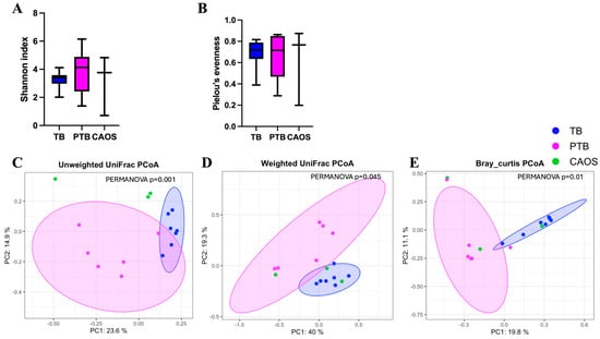 Beta diversity analysis revealed no statistically significant differences among the groups after FDR correction. Unweighted UniFrac showed a statistically significant difference before correction between TB and PTB (p = 0.045; q = 0.135), and weighted UniFrac between PTB and CAOS (p = 0.046; q = 0.120). The Bray–Curtis distances showed no significant difference (q = 0.313) (Figure 3C–E).