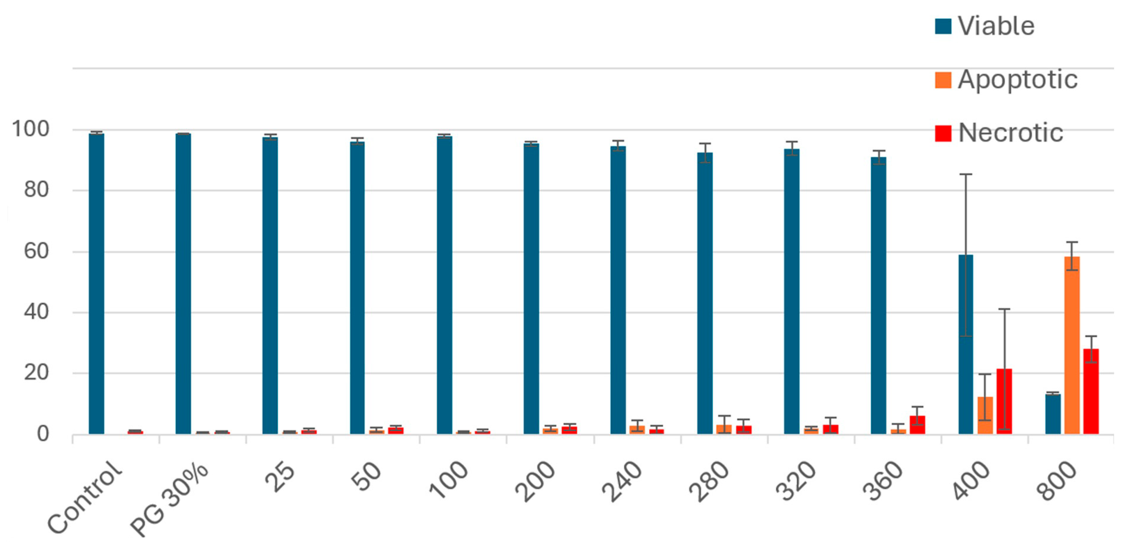 Figure 1. Determination of half-maximum inhibitory concentration of PSRE based on HGF-1 cell viability. PG 30%, 30% polyethylene glycol solution; concentrations of PSRE: 25–800 μg/mL; y-axis: % viable, apoptotic, and necrotic cells; n = 12.
