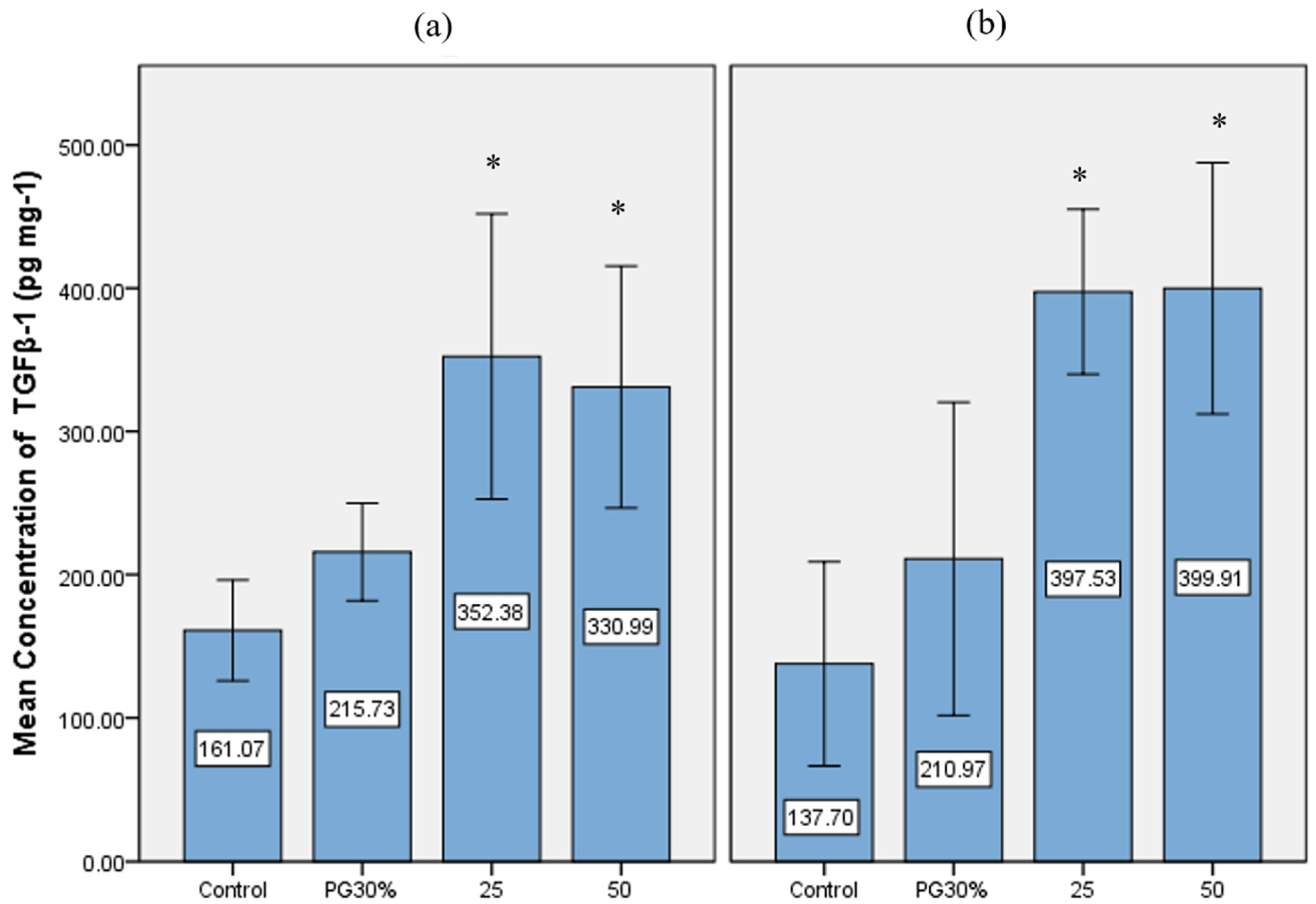 Figure 3. TGFβ-1 levels in PSRE-treated HGF-1 (a) and HPDLF (b) cells. Mean concentration of TGFβ-1 (pg/mL), n = 31. One-way ANOVA test followed by LSD post hoc test: * p < 0.001 compared with control. PG 30%, 30% polyethylene glycol solution; PSRE concentrations: 25–50 μg/mL.