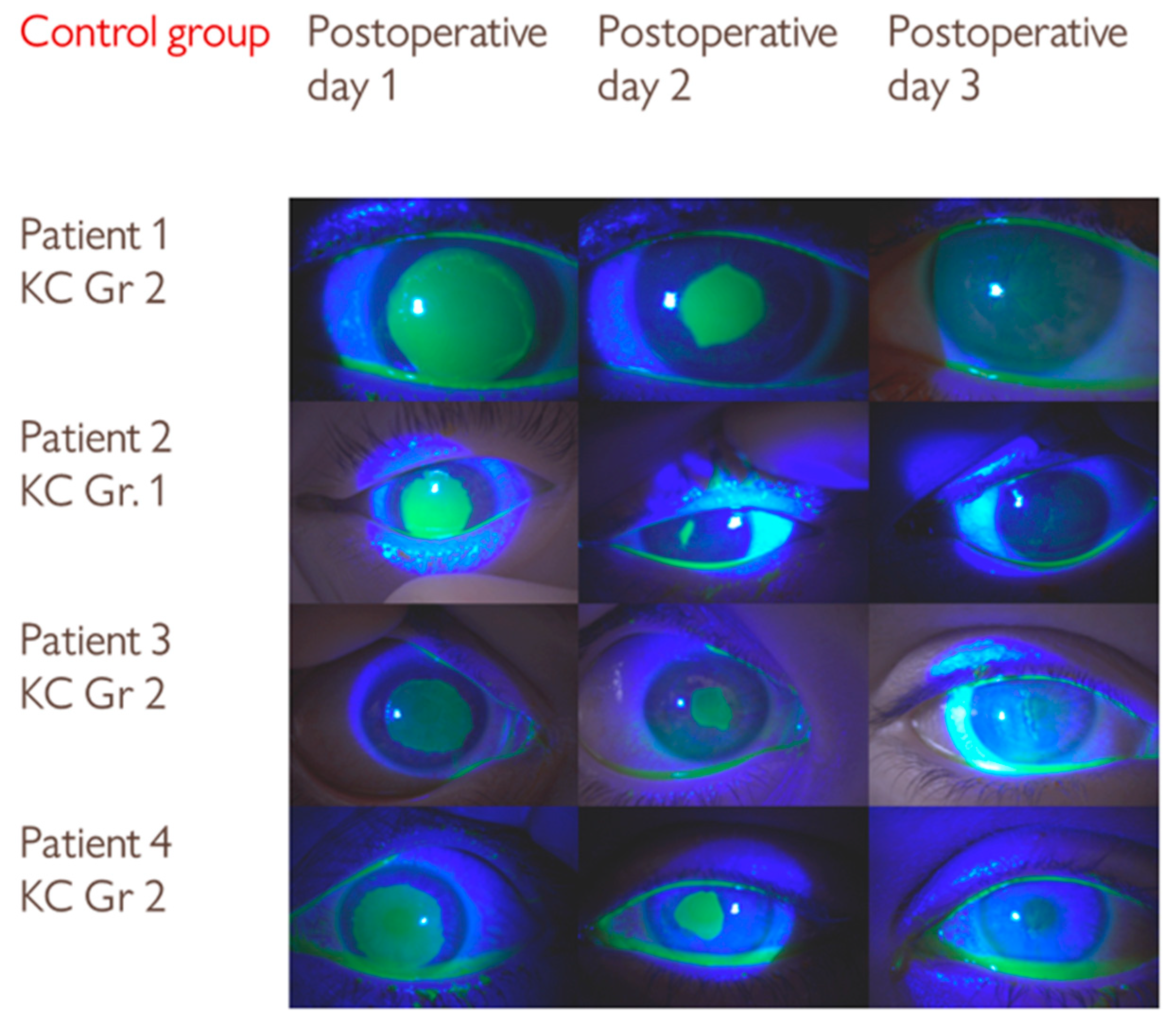 - Bata, A.M.; Witkowska, K.J.; Wozniak, P.A.; Fondi, K.; Schmidinger, G.; Pircher, N.; Szegedi, S.; Aranha Dos Santos, V.; Pantalon, A.; Werkmeister, R.M.; et al. Effect of a Matrix Therapy Agent on Corneal Epithelial Healing After Standard Collagen Cross-linking in Patients with Keratoconus: A Randomized Clinical Trial. JAMA Ophthalmol. 2016, 134, 1169–1176. [Google Scholar] [CrossRef]
