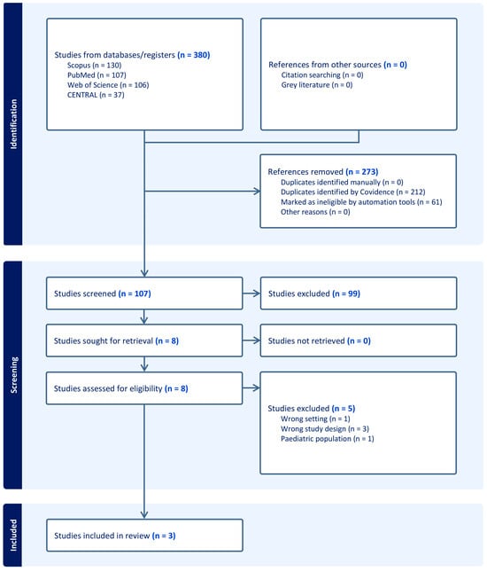 A total of 380 records were retrieved from the initial literature search. Following the automated exclusion of 273 irrelevant records, the titles and abstracts of the remaining 107 articles underwent screening. Consequently, 99 studies were excluded for failing to satisfy the inclusion criteria. Thus, eight articles were evaluated for eligibility by screening their full texts. Five studies were excluded for various reasons (Table S2). Ultimately, three RCTs [,,] were included in the qualitative and quantitative synthesis (Figure 1).