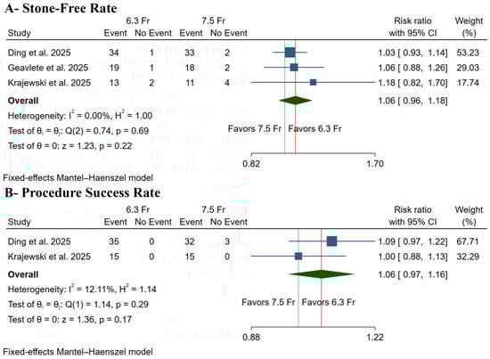 There was no significant difference between the two ureteroscope sizes regarding the incidence of stone-free rate, which was assessed either intraoperatively or at one-month post-surgery, (RR: 1.06, 95% CI [0.96, 1.18], p = 0.22) (Figure 3A) or procedure success rate (RR: 1.06, 95% CI [0.97, 1.16], p = 0.17) (Figure 3B). Pooled studies were homogeneous in both stone-free rate (I2 = 0%) and procedure success rate (I2 = 12.11%).