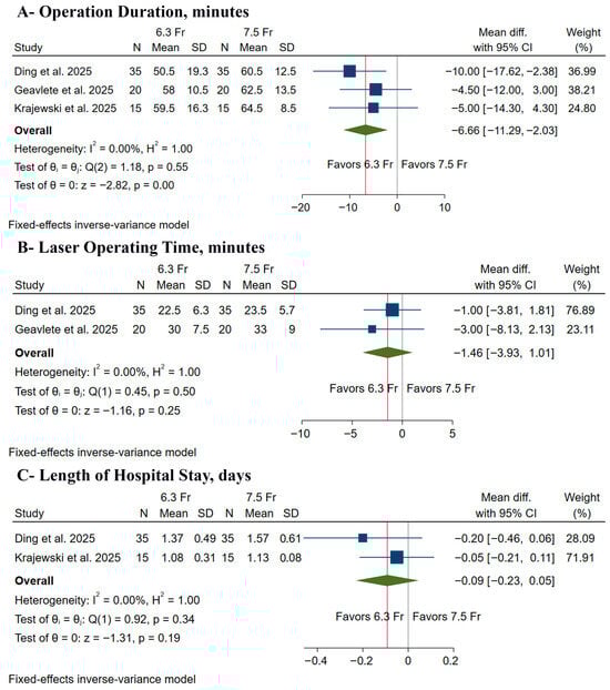 The 6.3 Fr ureteroscope was associated with a significantly shorter operation duration (MD: −6.66 min, 95% CI [−11.29, −2.03], p < 0.001) (Figure 4A); however, there was no significant difference between both groups in laser operating time (MD: −1.46 min, 95% CI [−3.93, 1.01], p = 0.25) (Figure 4B) or LoS (MD: −0.09 days, 95% CI [−0.23, 0.05], p = 0.19) (Figure 4C). Pooled studies were homogeneous in operation duration (I2 = 0%), laser operating time (I2 = 0%), and LoS (I2 = 0%).