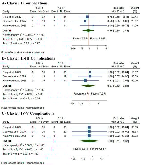 There was no significant difference between the two strategies regarding the incidence of Clavien I complications (RR: 0.86, 95% CI [0.30, 2.43], p = 0.77) (Figure 5A), Clavien II–III complications (RR: 0.67, 95% CI [0.12, 3.84], p = 0.65) (Figure 5B), or Clavien IV–V complications (RR: 1.00, 95% CI [0.11, 9.37], p = 1.00) (Figure 5C). Pooled studies were homogeneous in Clavien I complications (I2 = 0%), Clavien II–III complications (I2 = 0%), and Clavien IV–V complications (I2 = 0%).