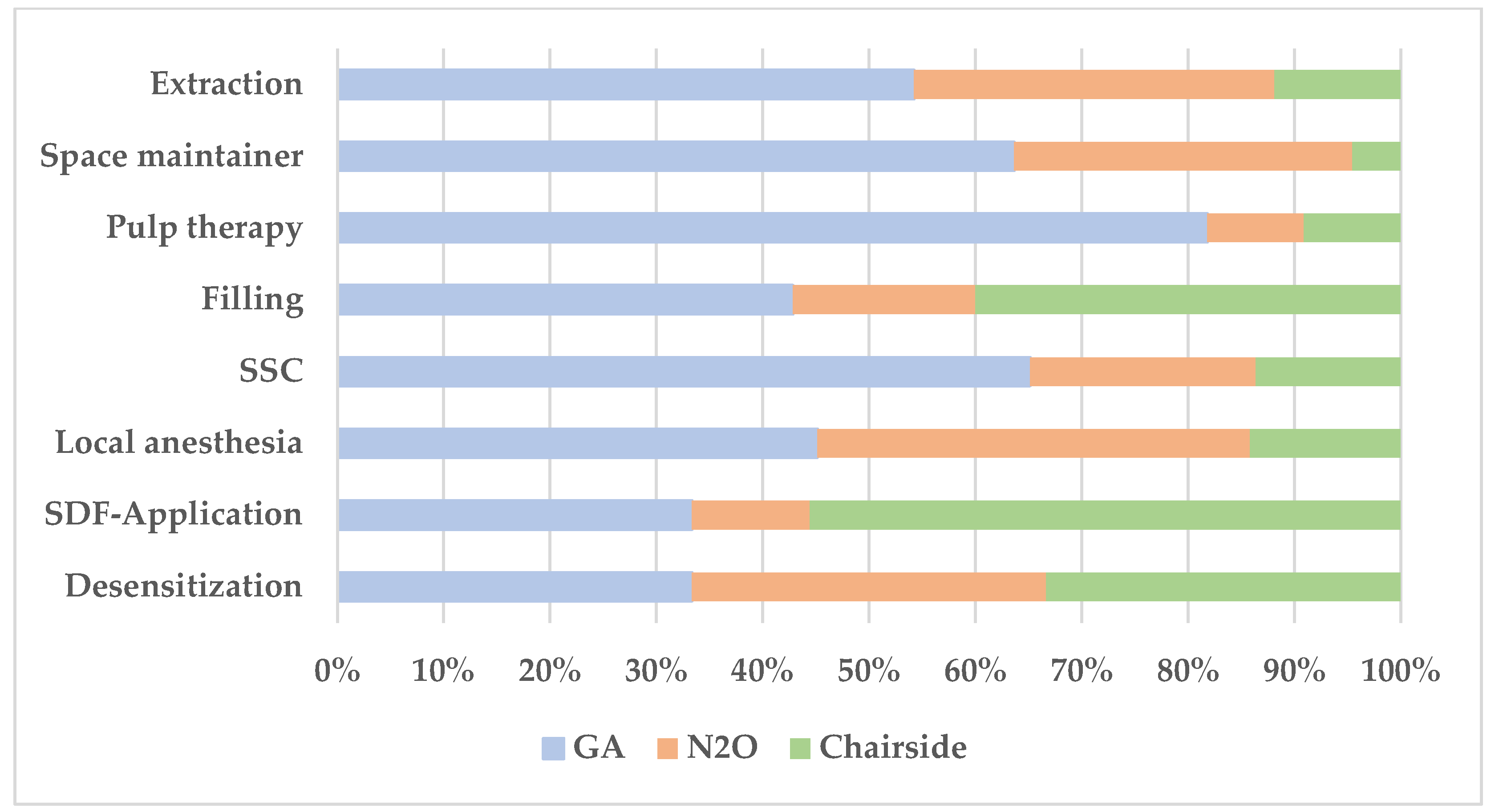 - Mourad, M.S.; Splieth, C.H.; Al Masri, A.; Schmoeckel, J. Potential for nitrous oxide sedation in pedodontics practice to reduce the need for dental general anesthesia. Quintessence Int. 2022, 53, 598–606. [Google Scholar] [CrossRef]