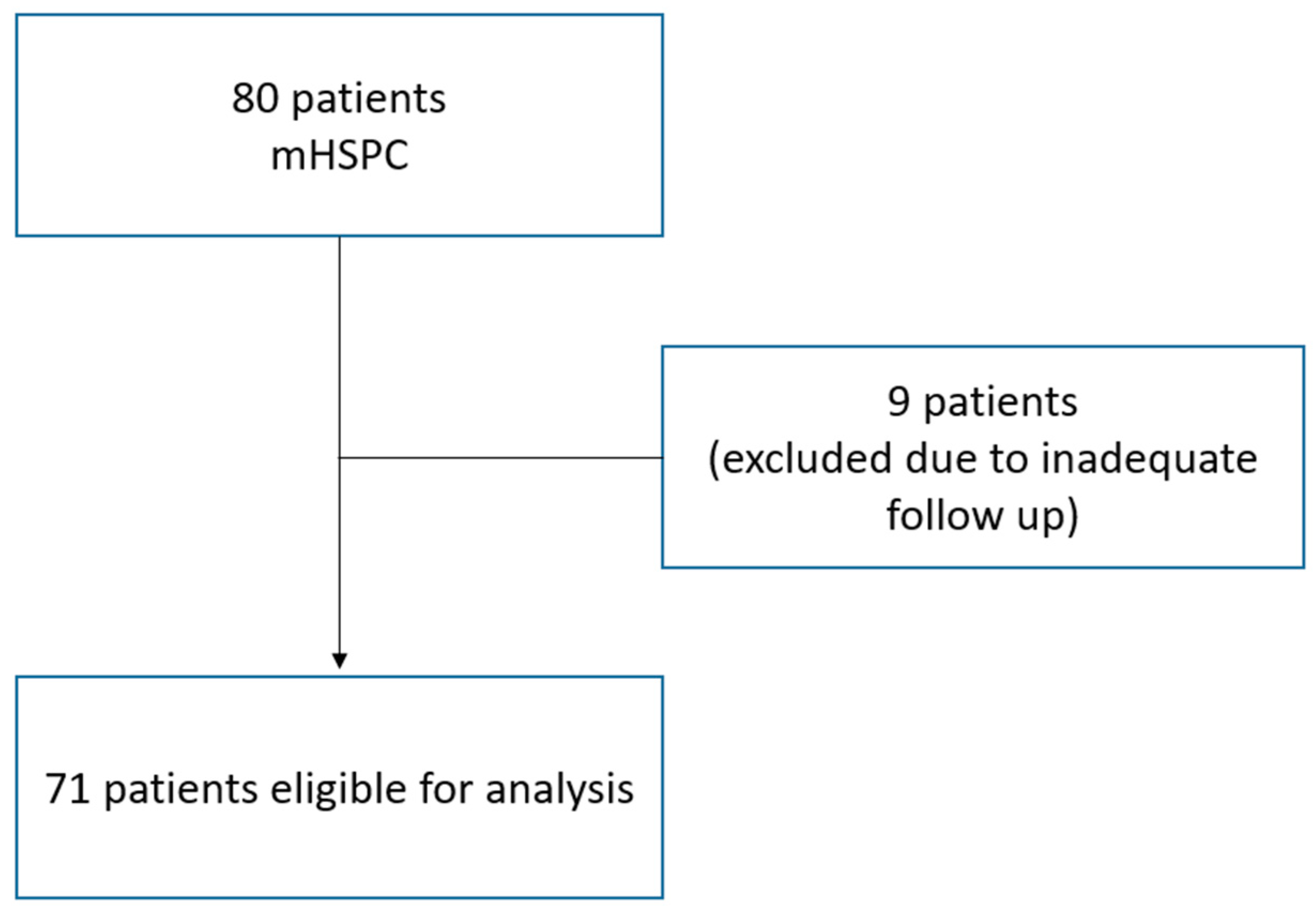 - López-Abad, A.; Belmonte, M.; Ramírez Backhaus, M.; Server Gómez, G.; Cao Avellaneda, E.; Moreno Alarcón, C.; López Cubillana, P.; Yago Giménez, P.; de Pablos Rodríguez, P.; Juan Fita, M.J.; et al. Ultralow prostate-specific antigen (PSA) levels and improved oncological outcomes in metastatic hormone-sensitive prostate cancer (mHSPC) patients treated with Apalutamide: A real-world multicentre study. J. Clin. Med. 2024, 13, 6221. [Google Scholar] [CrossRef] [PubMed]