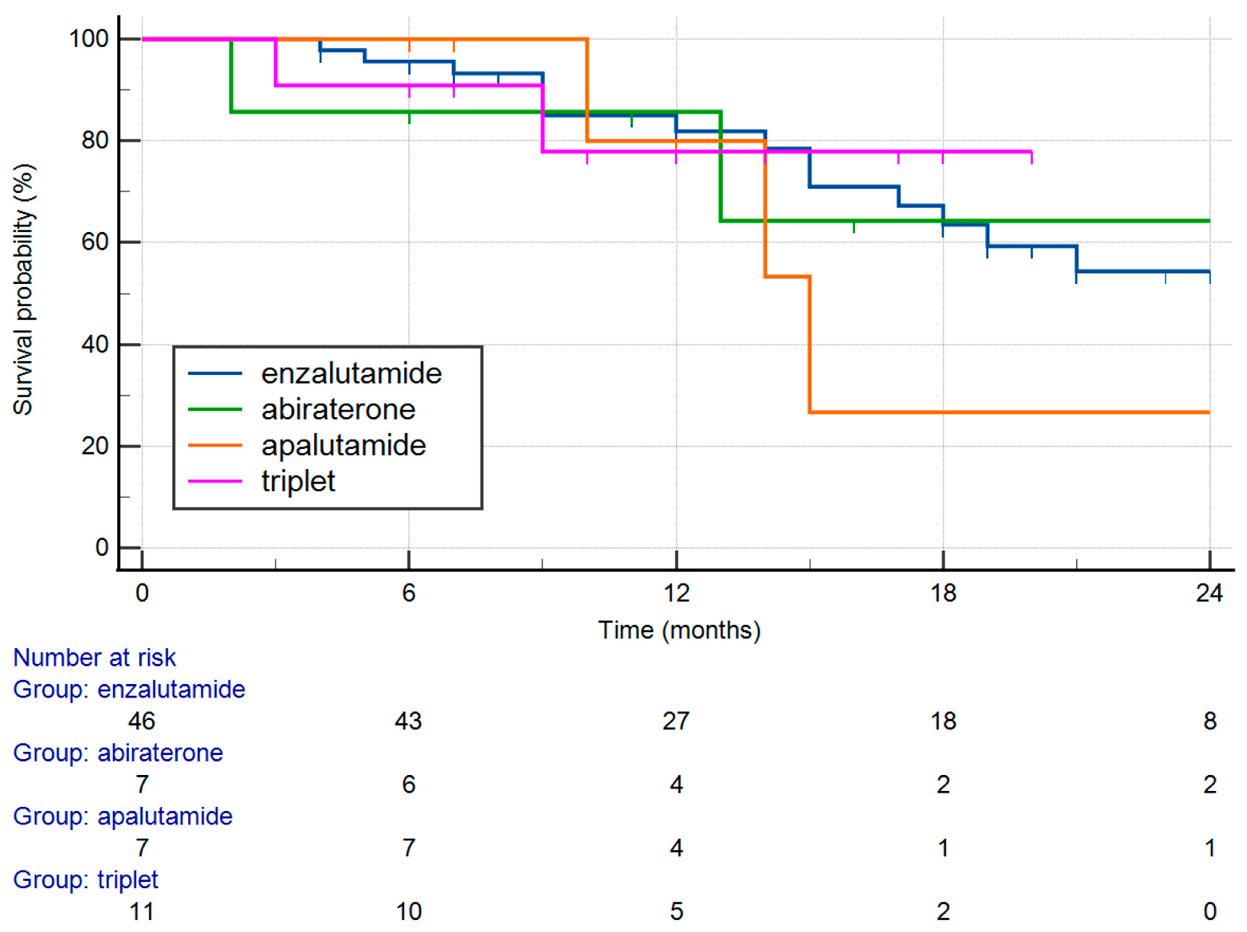 - Martínez-Corral, R.; De Pablos-Rodríguez, P.; Bardella-Altarriba, C.; Vera-Ballesteros, F.J.; Abella-Serra, A.; Rodríguez-Part, V.; Martínez-Corral, M.E.; Picola-Brau, N.; López-Abad, A.; Gómez-Ferrer, Á.; et al. PSA Kinetics and Predictors of PSA Response in Metastatic Hormone-Sensitive Prostate Cancer Treated with Androgen Receptor Signaling Inhibitors. Urol. Oncol. 2025, 43, 527.e9–527.e15. [Google Scholar] [CrossRef] [PubMed]